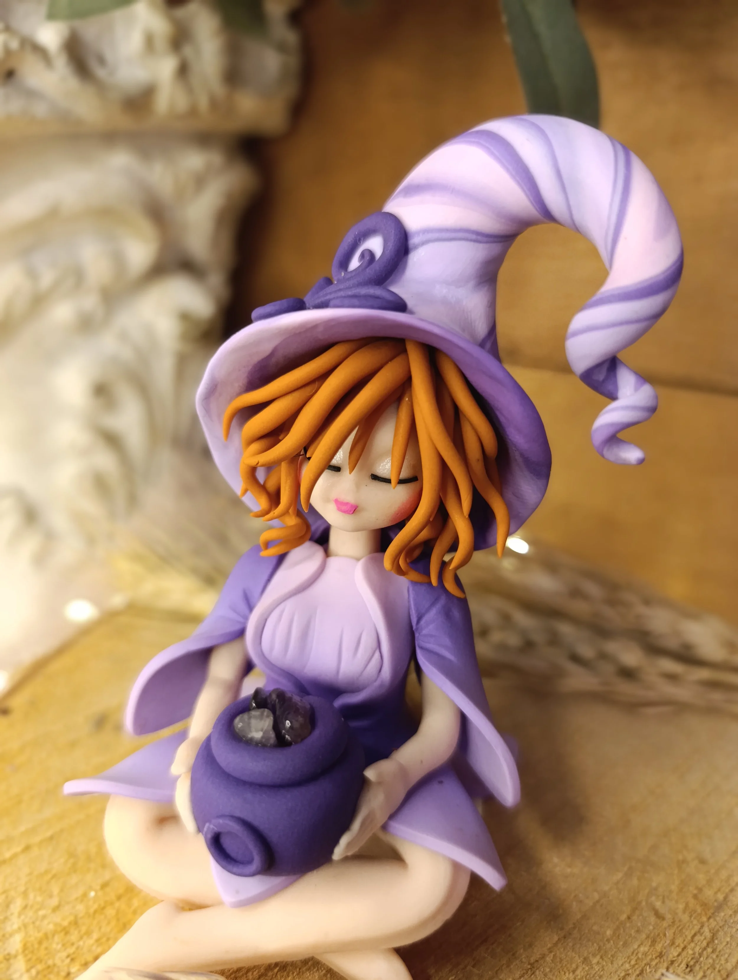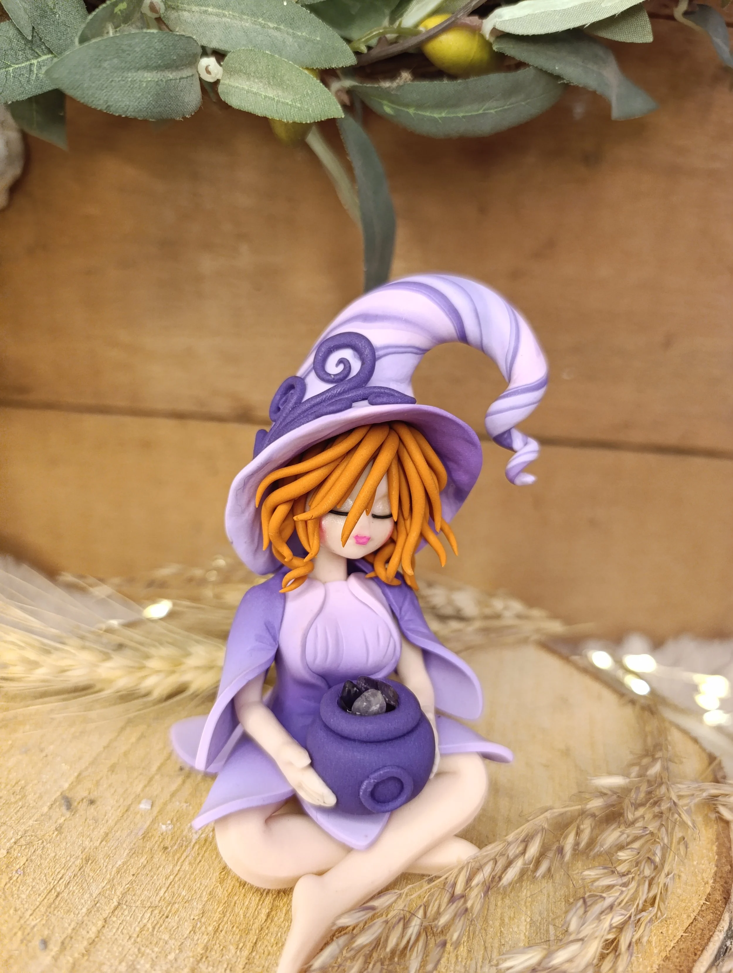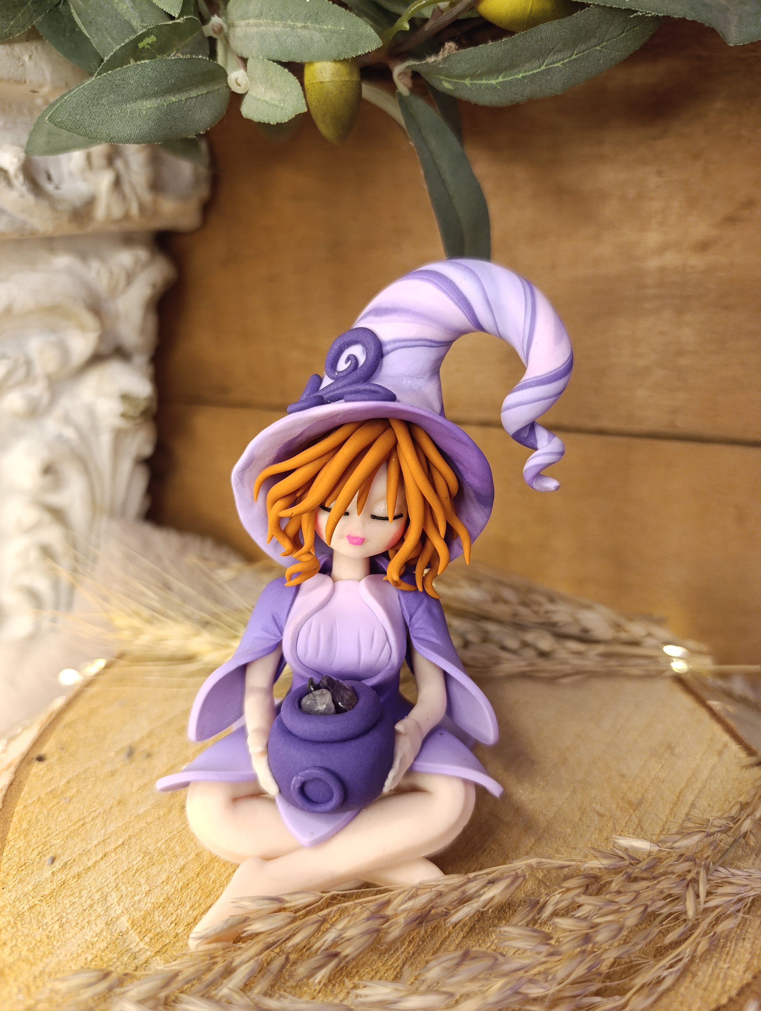 Pièce unique — Figurine sorcière artisanale entièrement modelée à la main en pâte polymère (Fimo). Chaudron miniature contenant des éclats d'améthyste véritables. Cape. Chapeau spiralé. Robe en pétales. Finition satinée.
