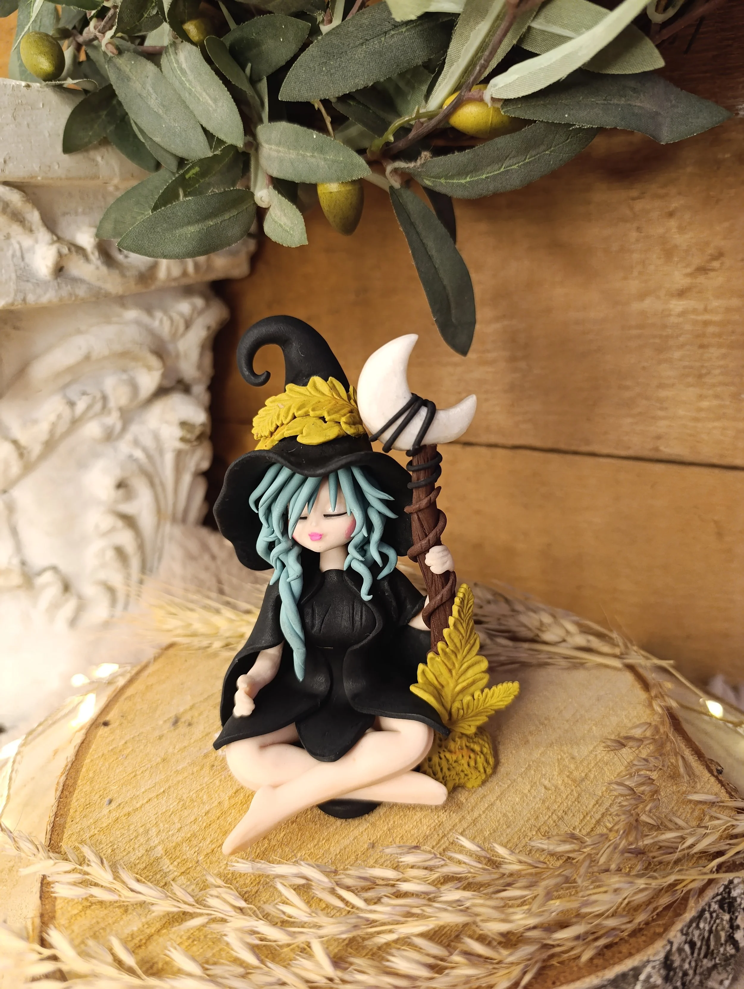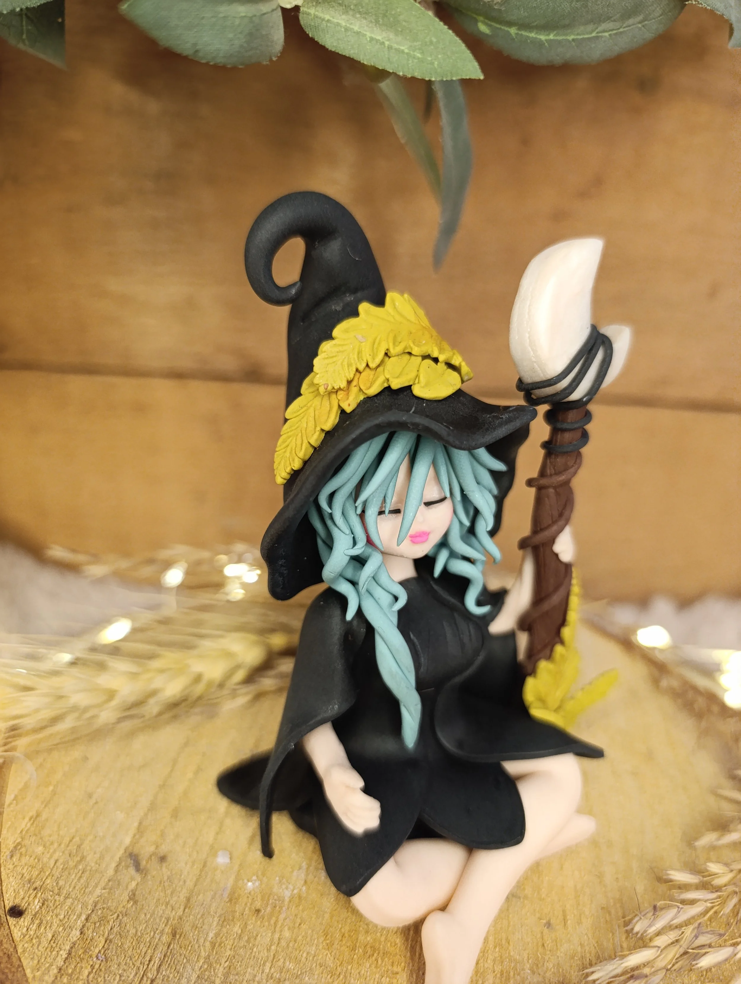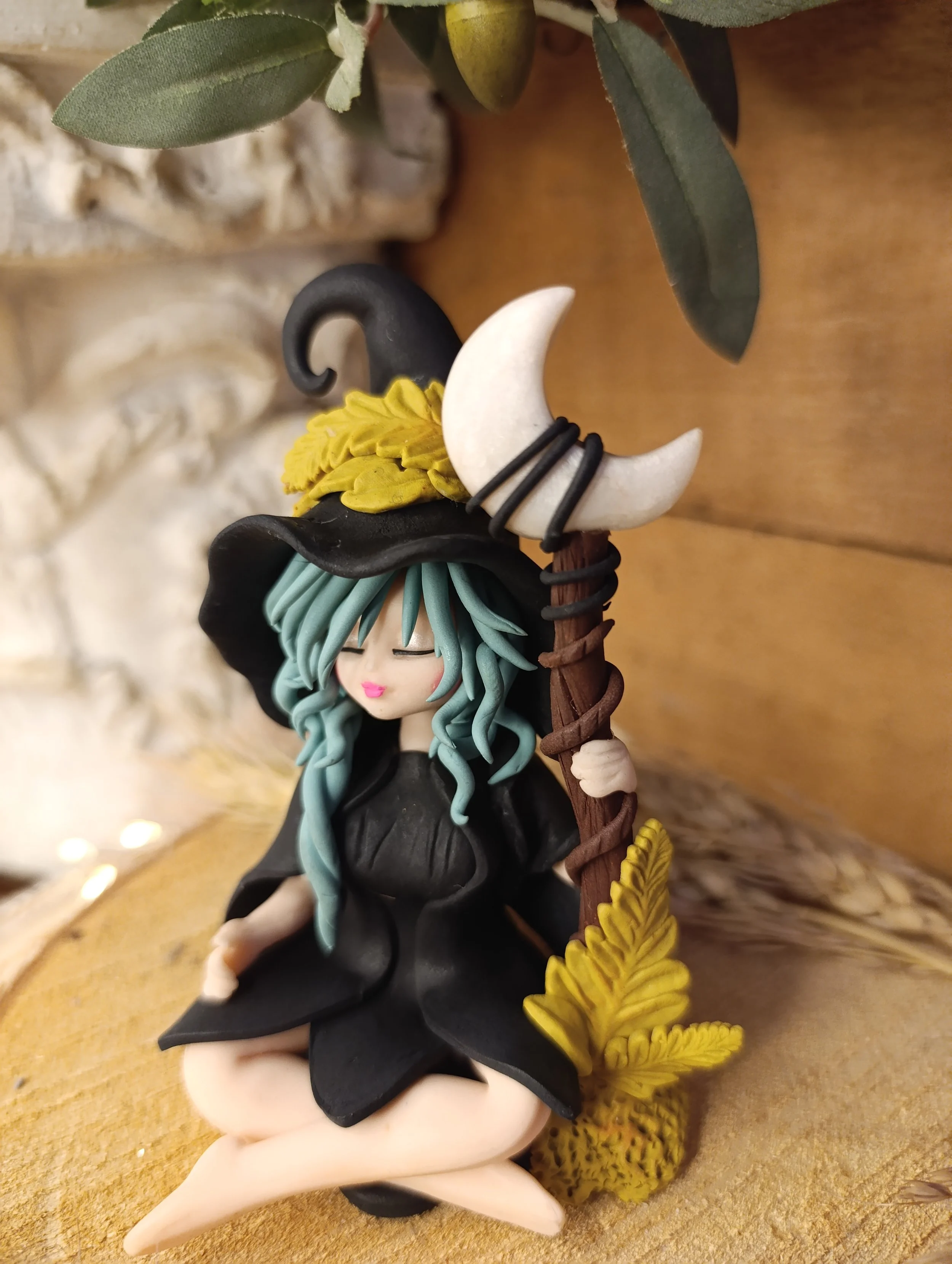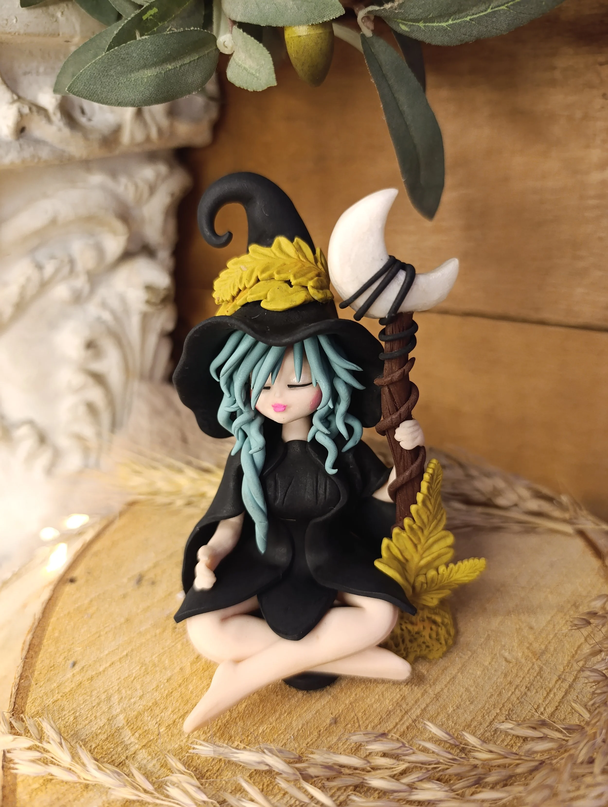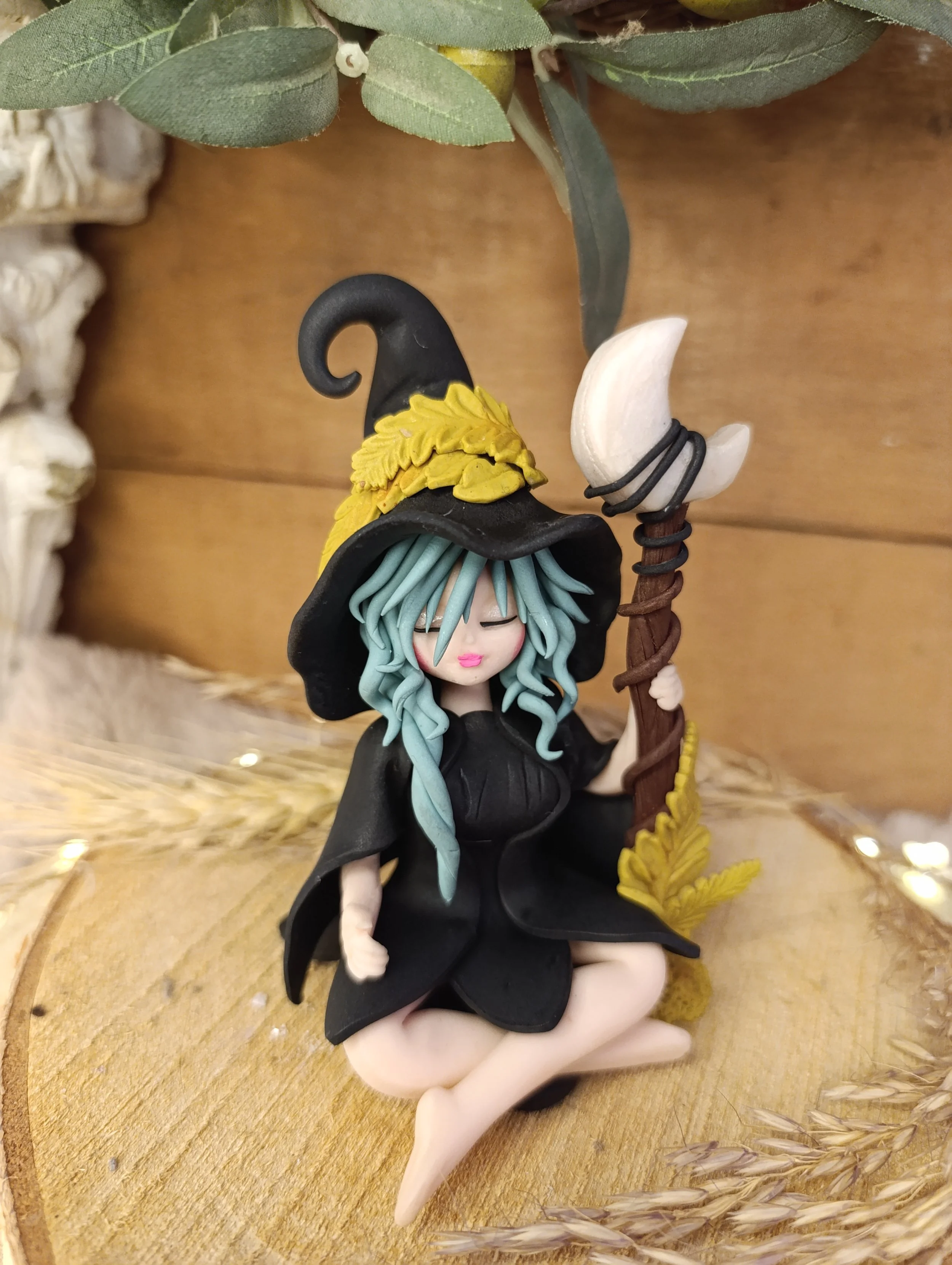 Pièce unique — Figurine sorcière artisanale entièrement modelée à la main en pâte polymère (Fimo). Bâton de lune en pâte polymère. Cape noire. Chapeau noir avec croissant de lune et feuilles de fougère. Robe noire en pétales. Finition satinée.