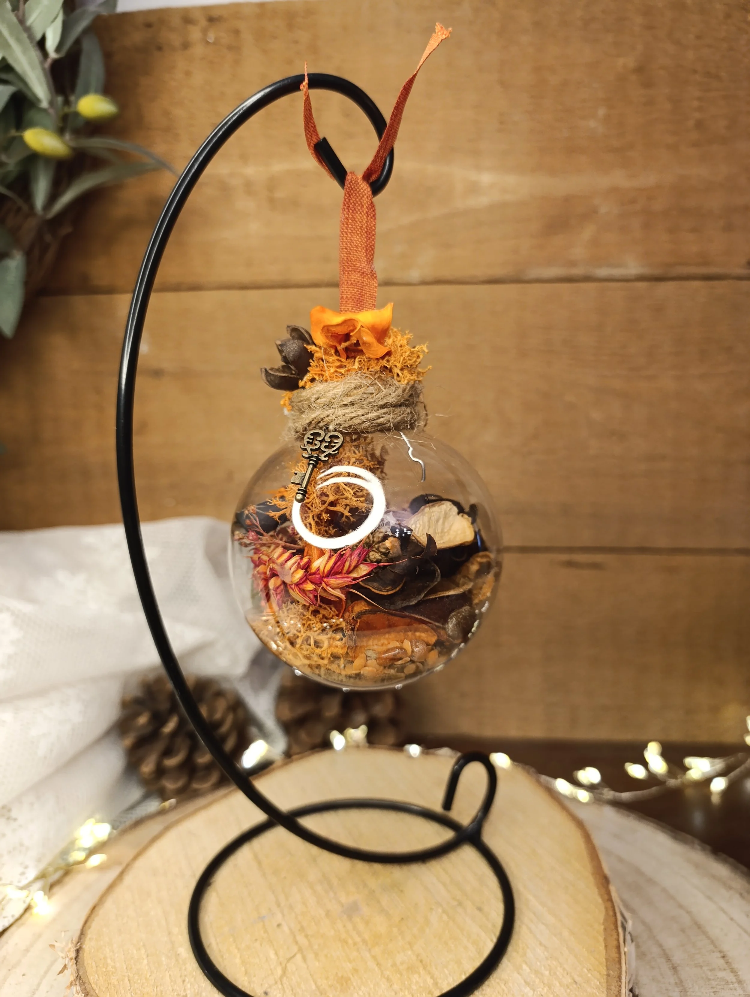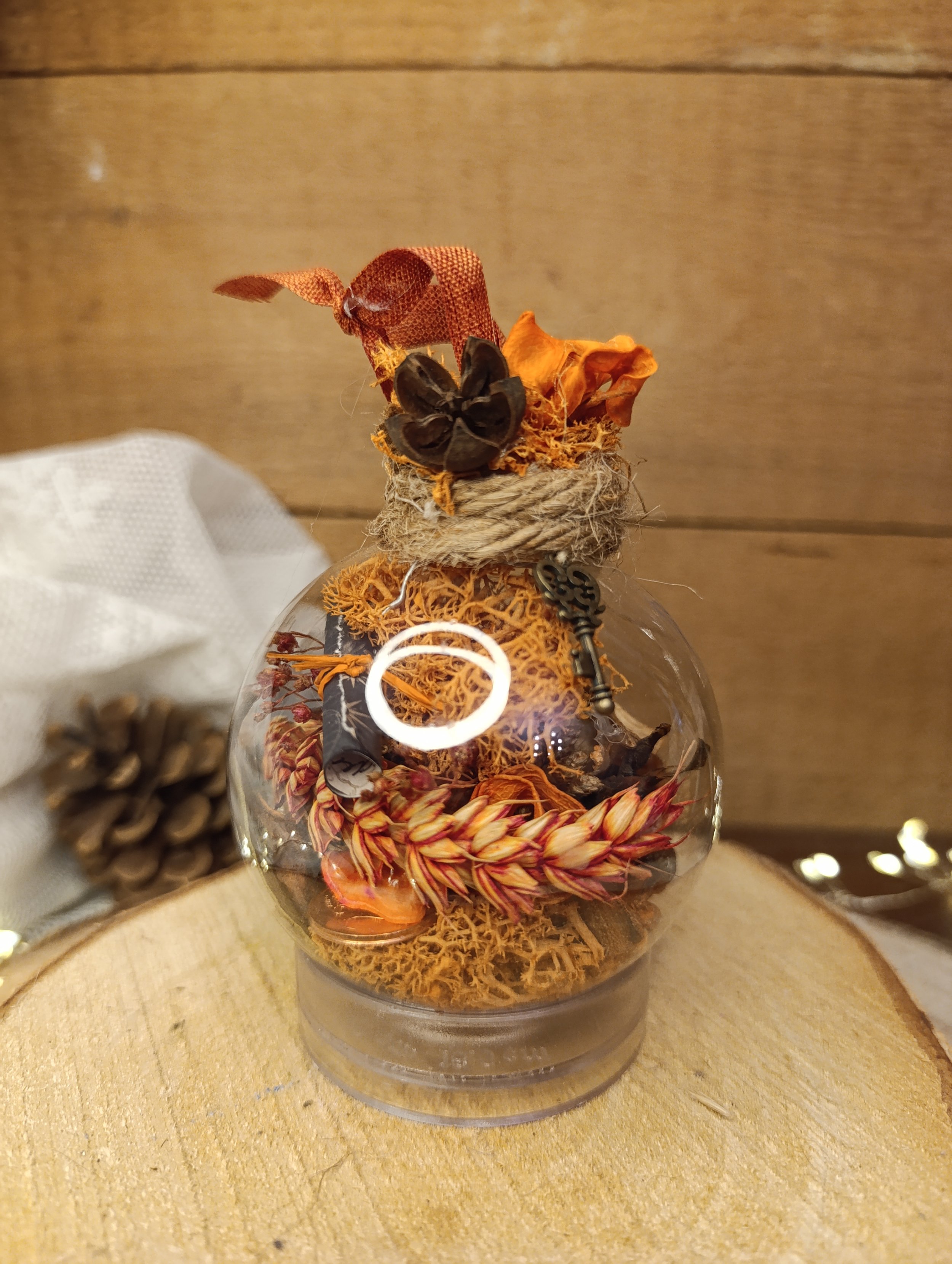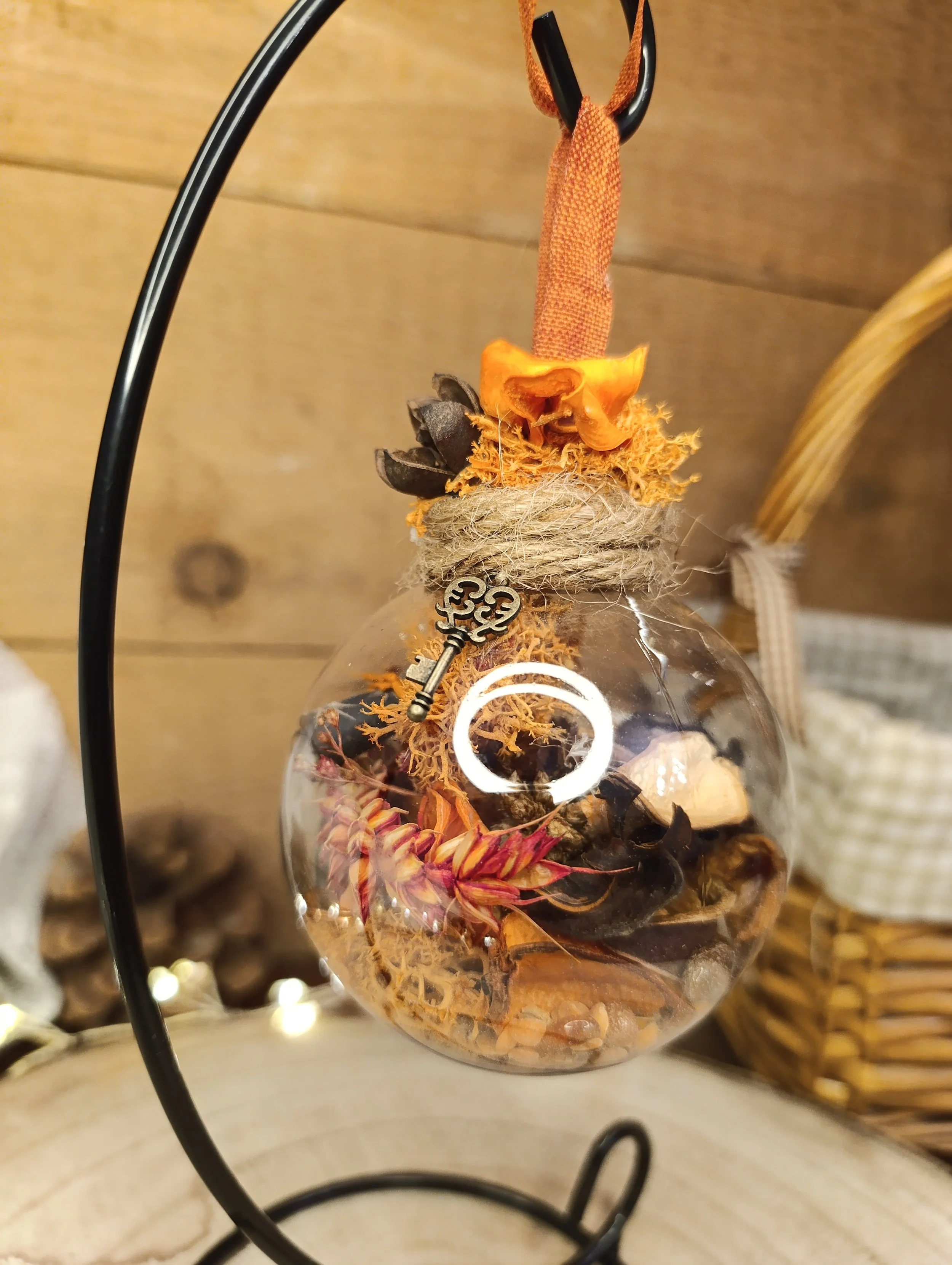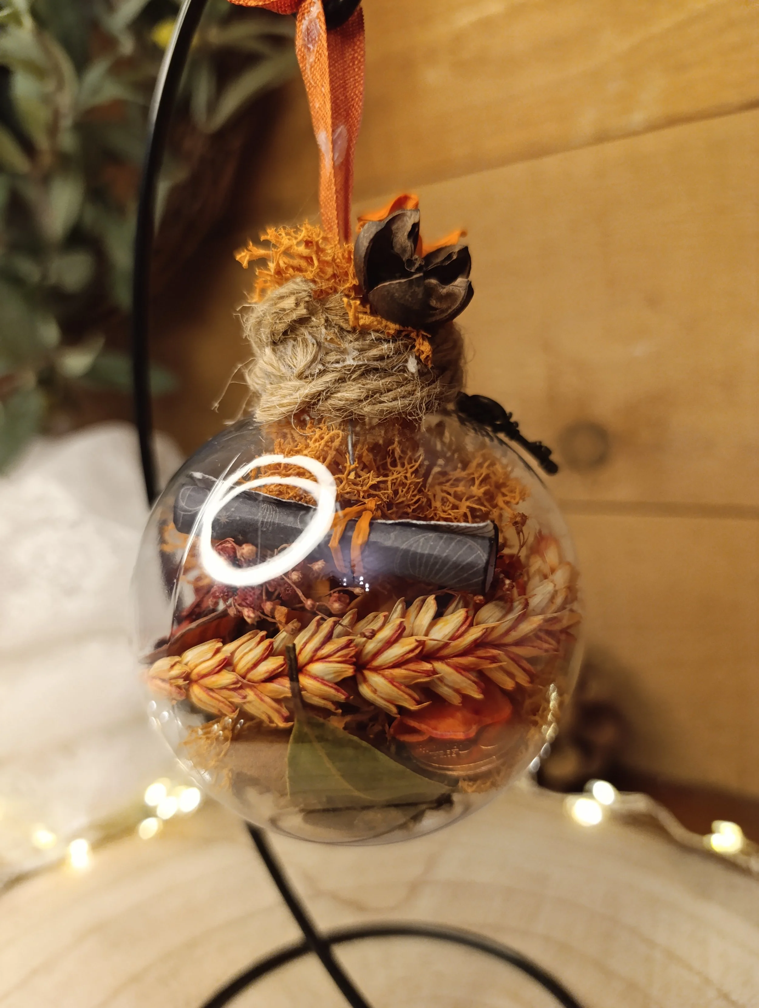 Plongez dans l'univers chaleureux de la Boule d'Automne, une création vibrante aux couleurs marron et orange, conçue pour attirer l'abondance et célébrer la richesse que la saison des récoltes nous offre.