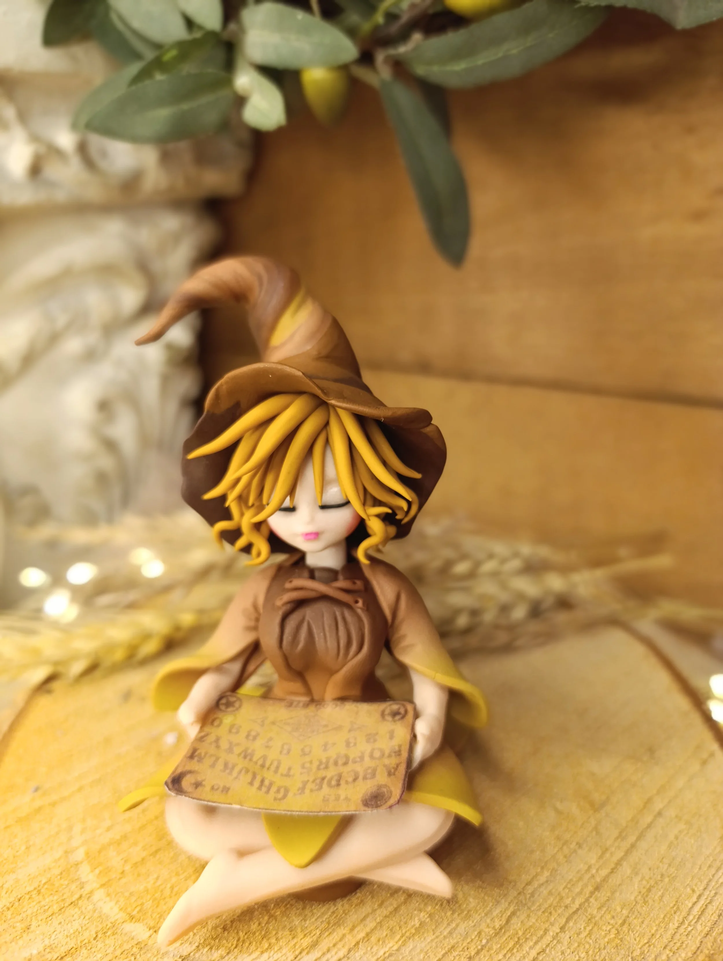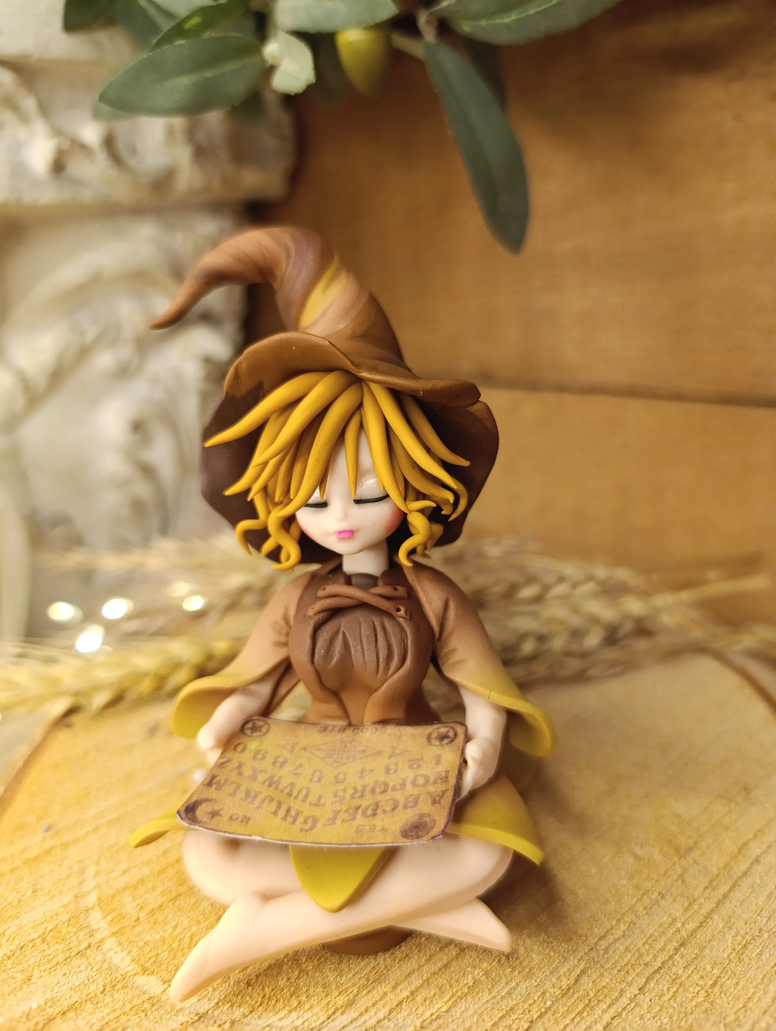 Pièce unique — Figurine sorcière artisanale entièrement modelée à la main en pâte polymère (Fimo). Planche de Ouija miniature. Cape. Robe en pétales. Finition satinée.