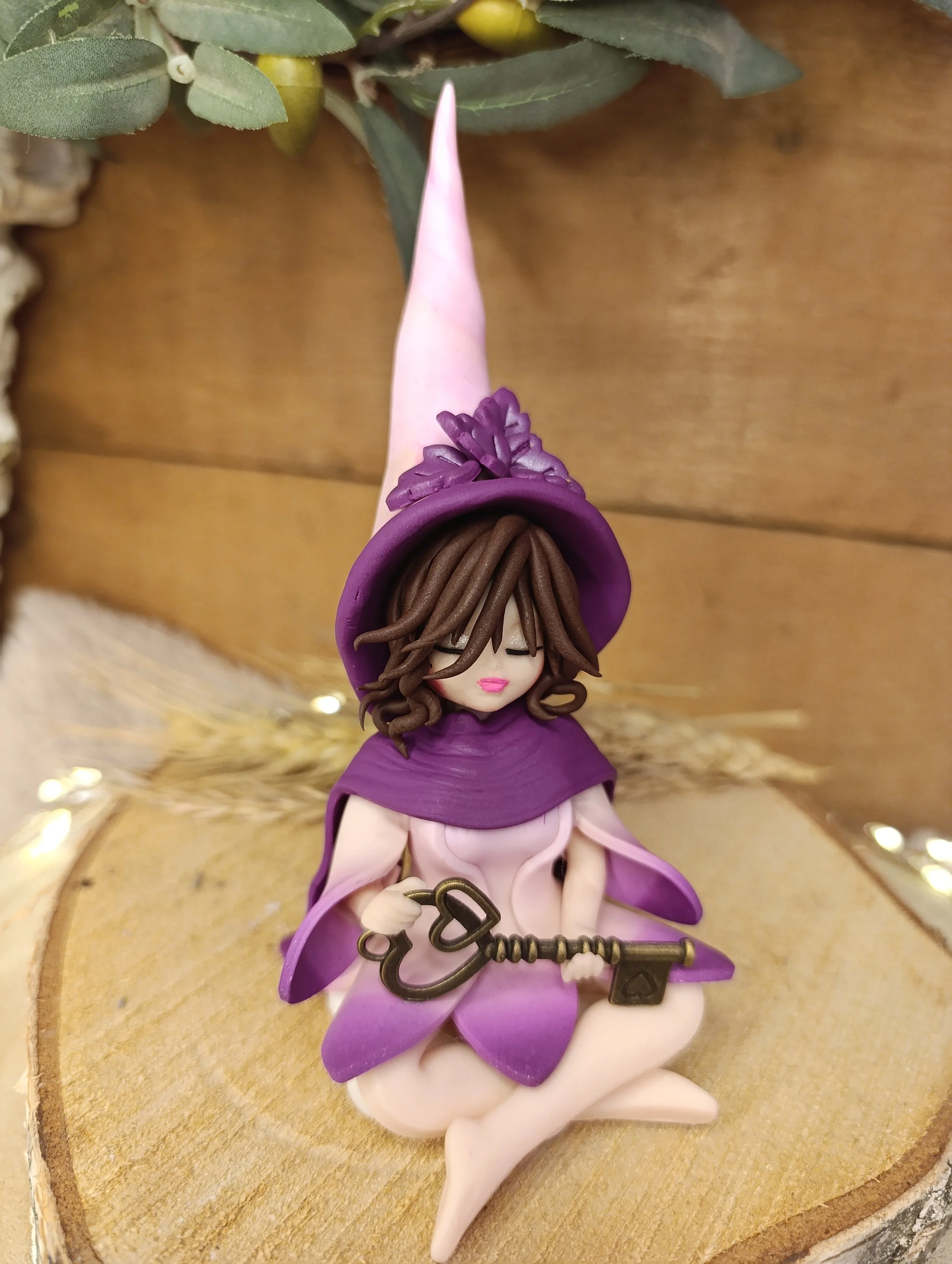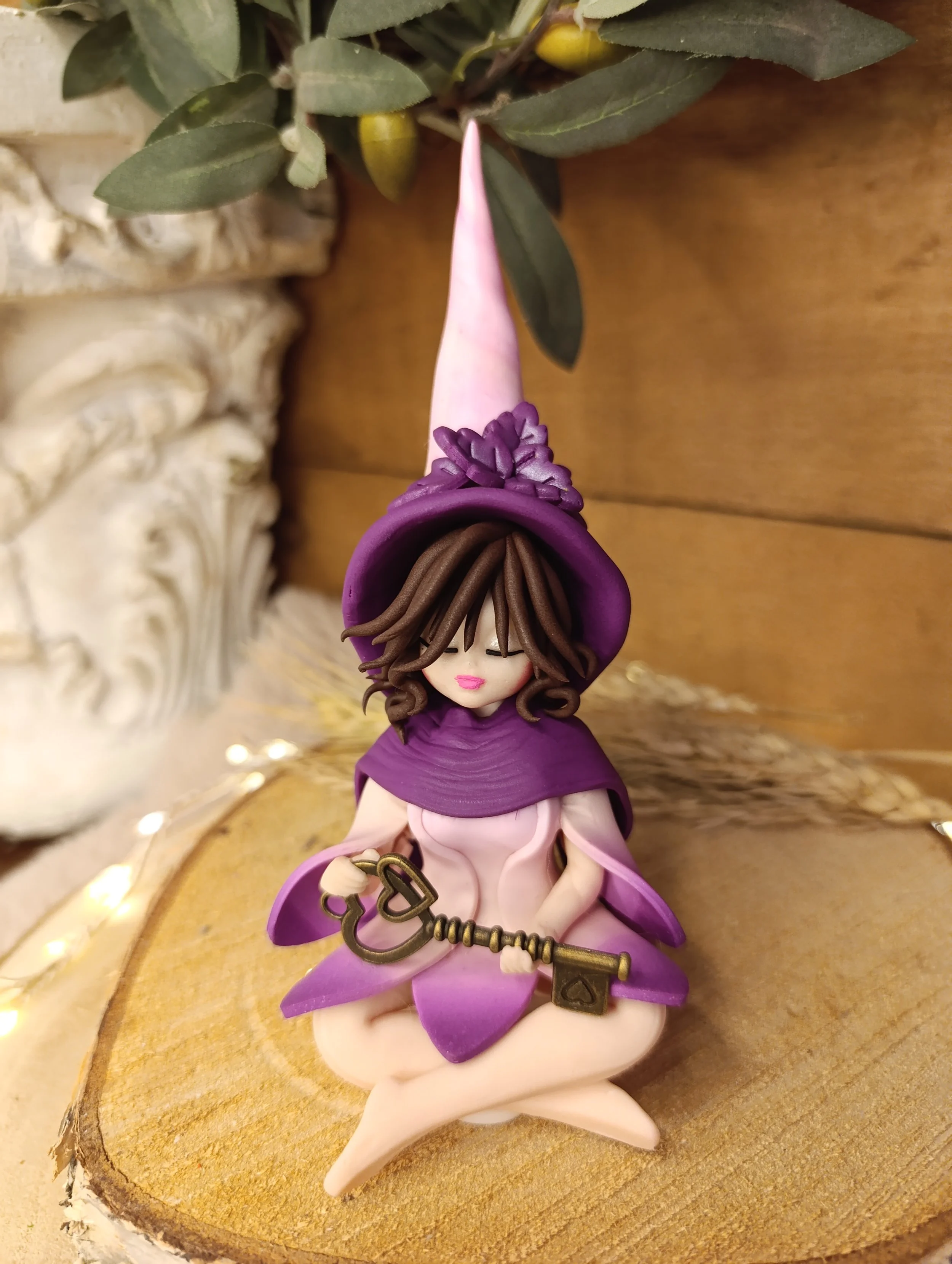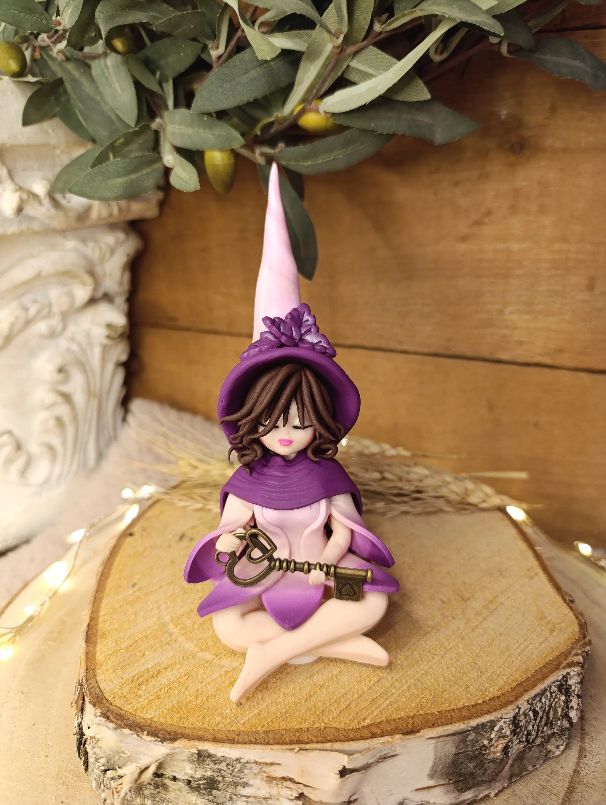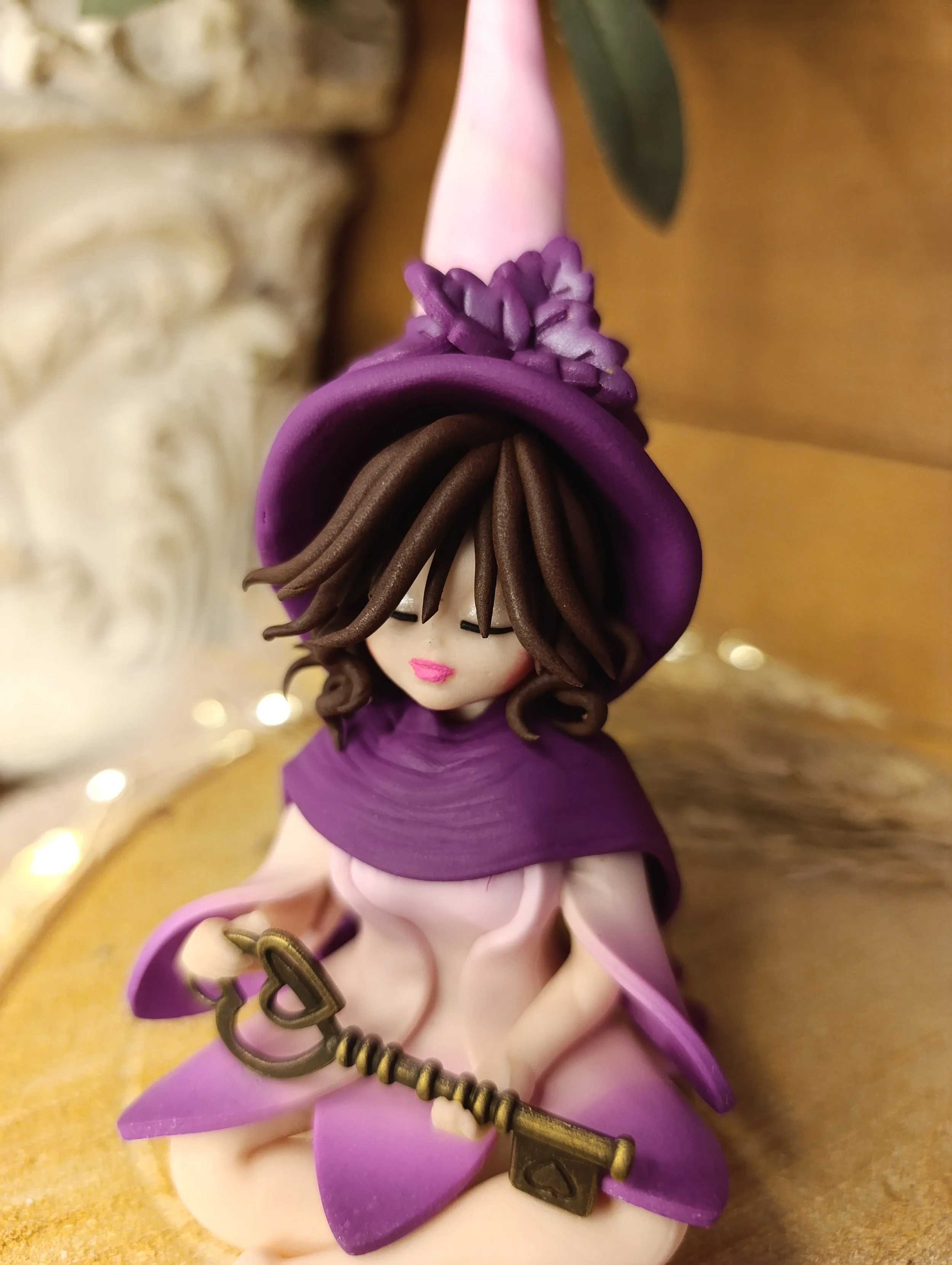 Découvrez Enora, une gardienne des mystères intérieurs façonnée à la main en pâte polymère (Fimo), vernie d'une finition satinée. Assise en silence, elle tient dans ses mains une clé ancienne, symbole des portes que nous gardons fermées au plus profond de nous.