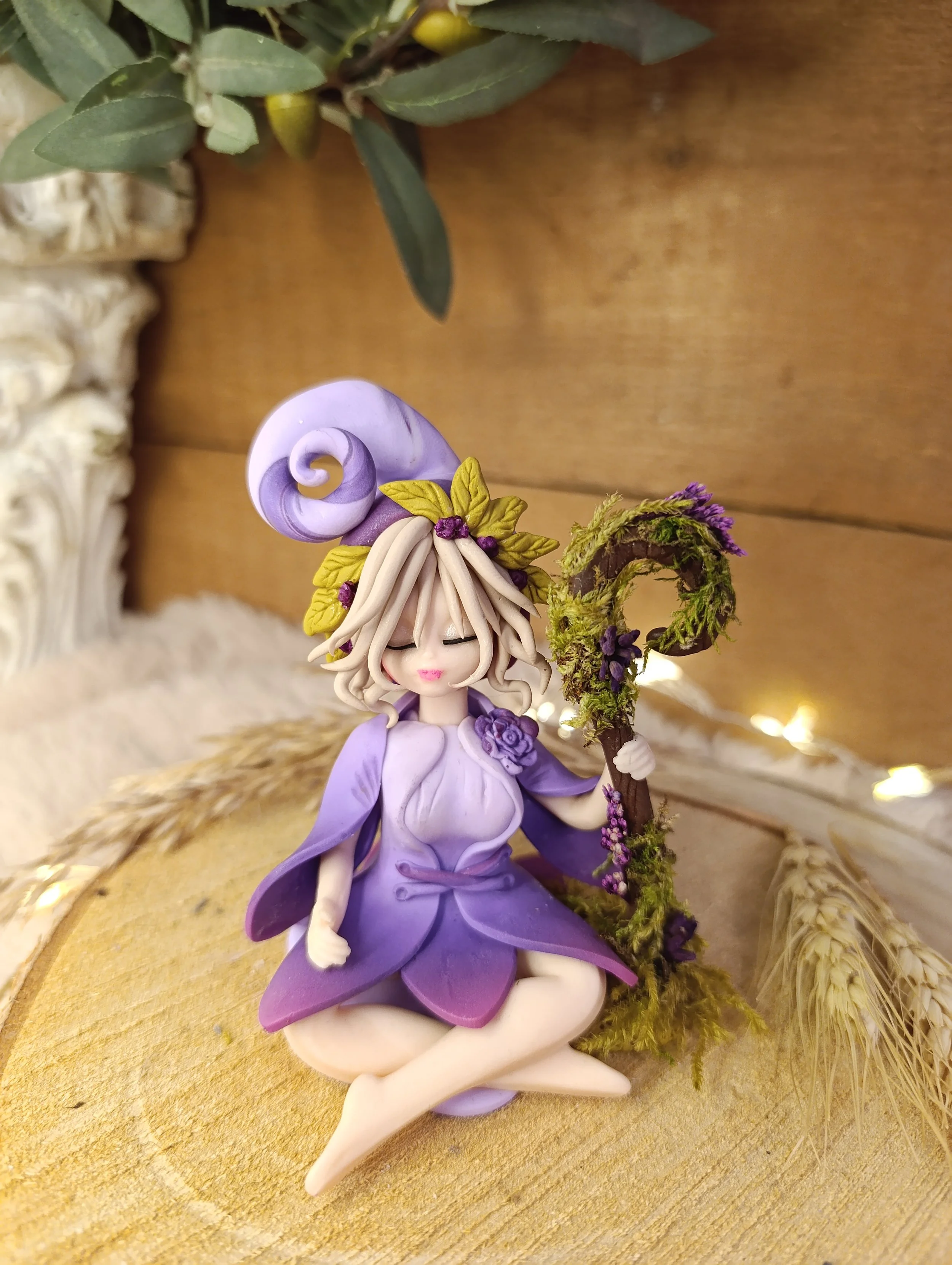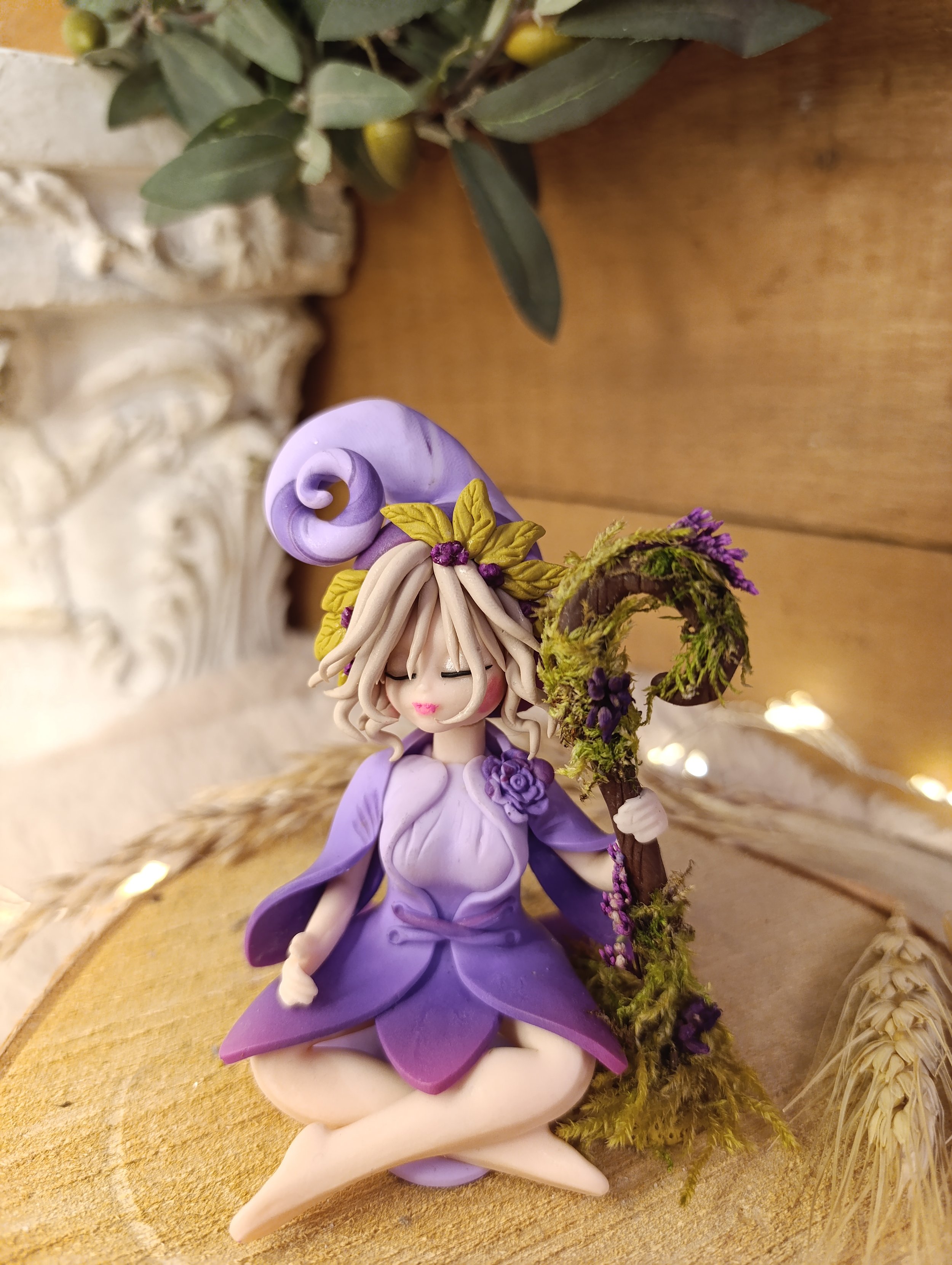 Pièce unique — Figurine sorcière artisanale entièrement modelée à la main en pâte polymère (Fimo). Chapeau de sorcière lilas avec spirale, feuilles en polymère et fleurs séchées violettes. Longs cheveux blancs avec feuilles en polymère et fleurs séchées. Rose violette sculptée. Cape et robe en pétales violet et lavande. Bâton de bois spiralé avec vraie mousse naturelle et fleurs séchées violettes. Finition satinée.