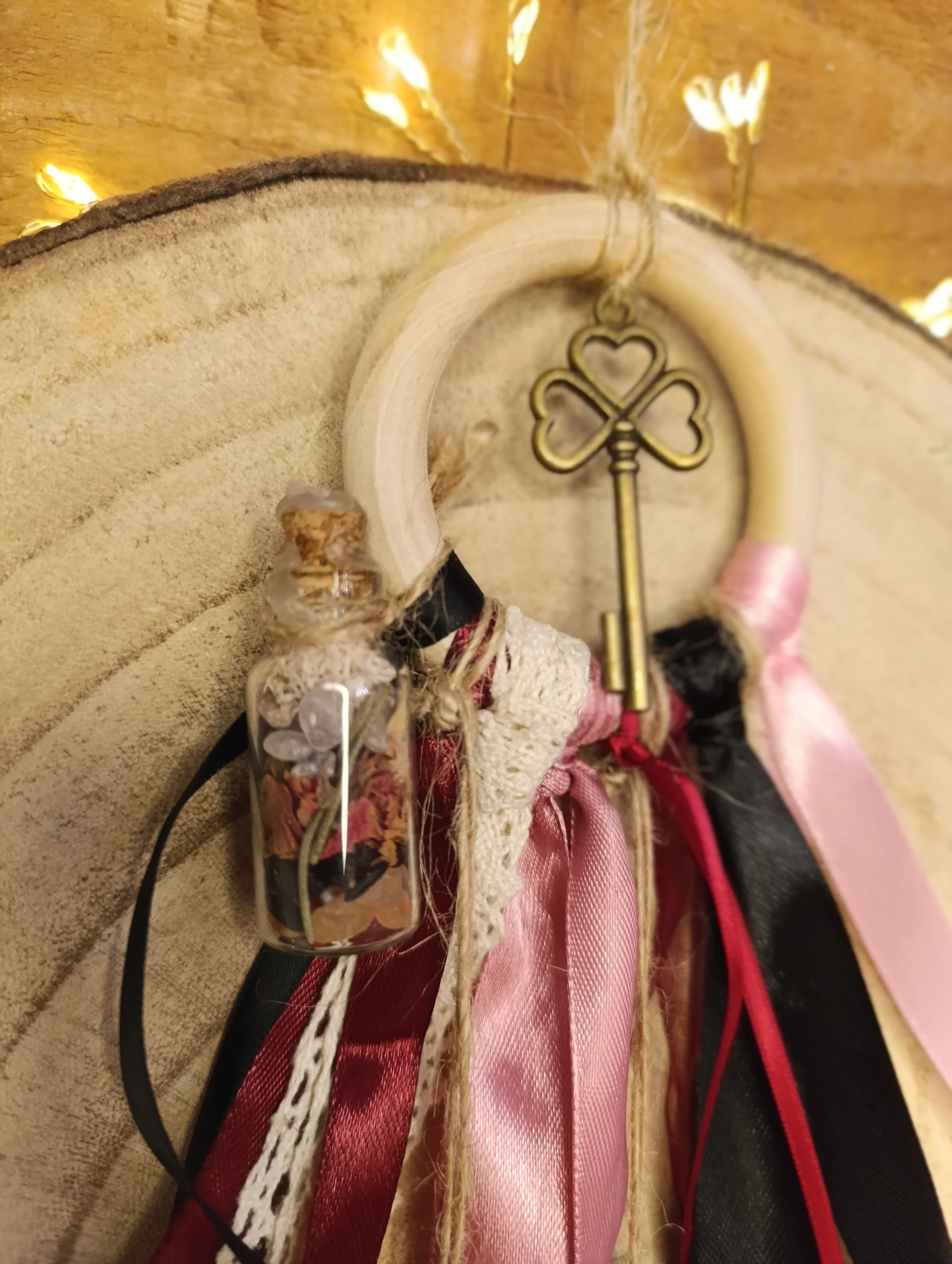 AccrochĂ©e Ă lâanneau, une petite fiole scellĂ©e Ă la cire blanche renferme un mĂ©lange alchimique dâamour, de chance et de sĂ©rĂ©nitĂ© :