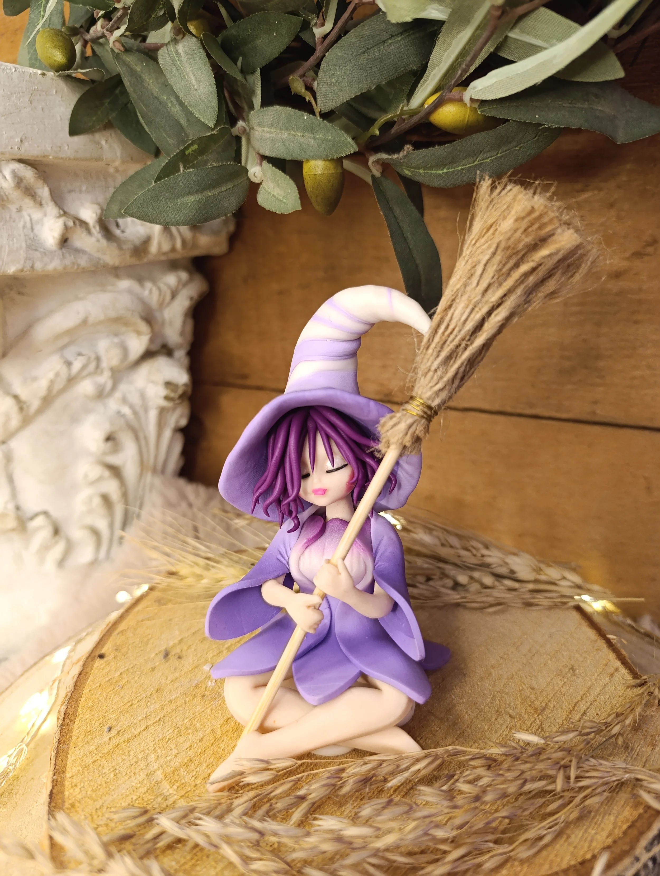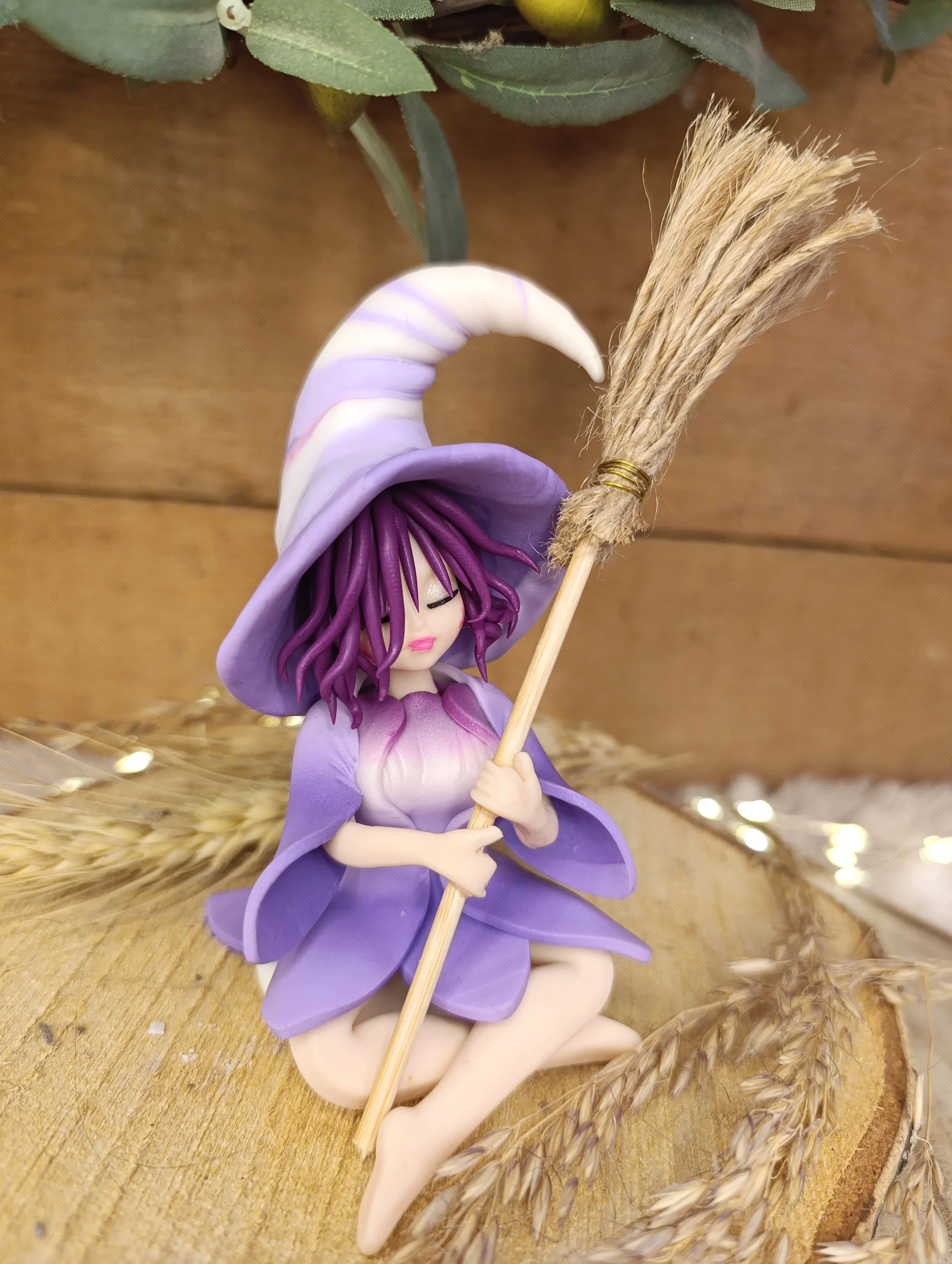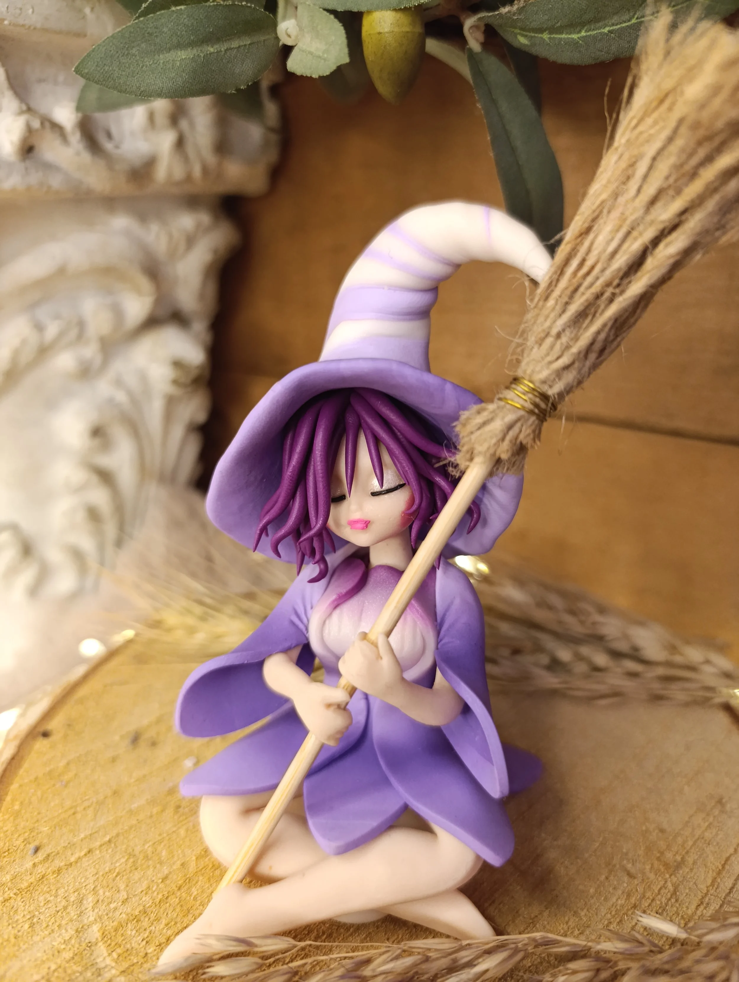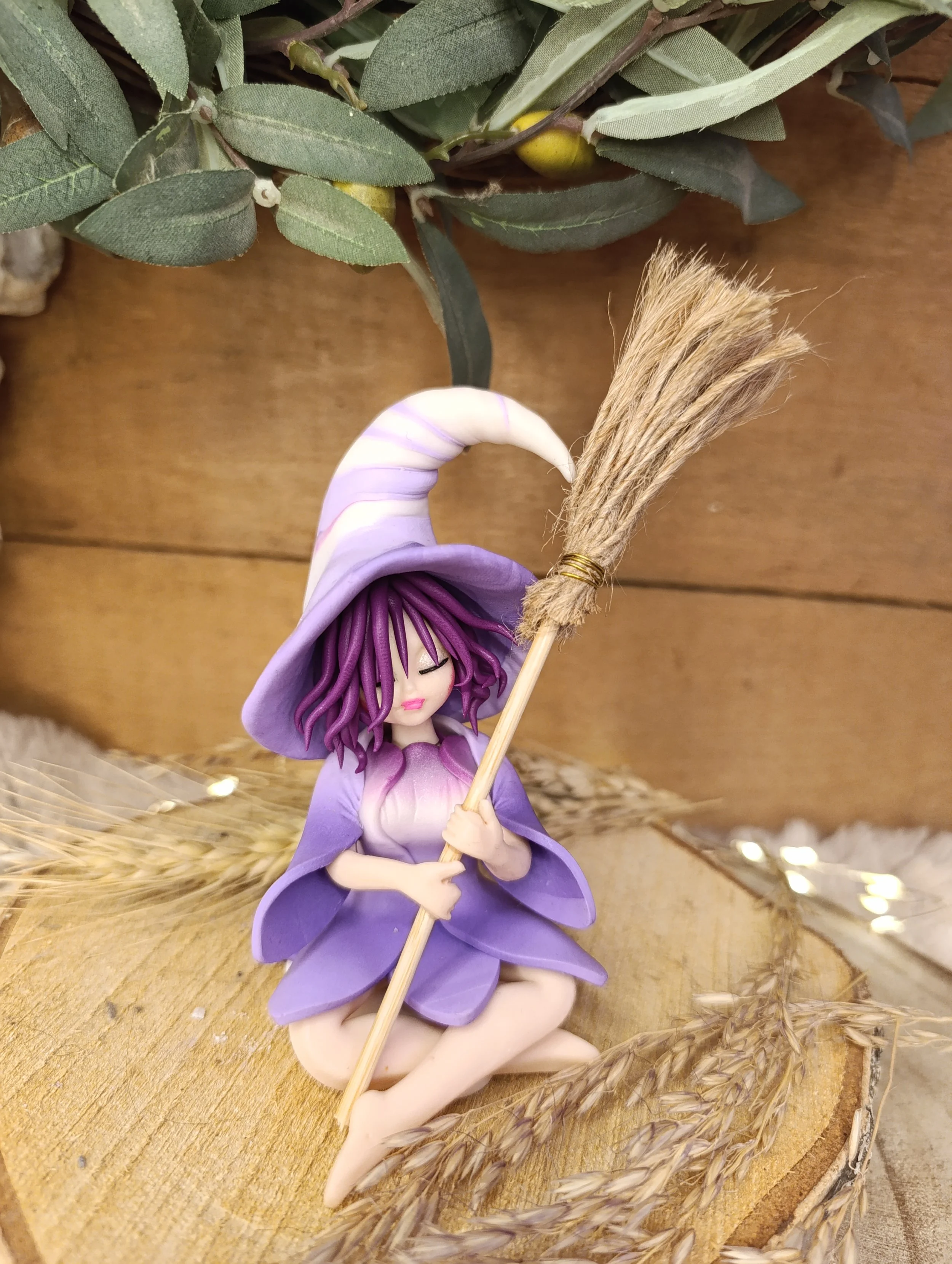 Pièce unique — Figurine sorcière artisanale entièrement modelée à la main en pâte polymère (Fimo). Balai naturel. Cape. Chapeau spiralé. Robe en pétales. Finition satinée.