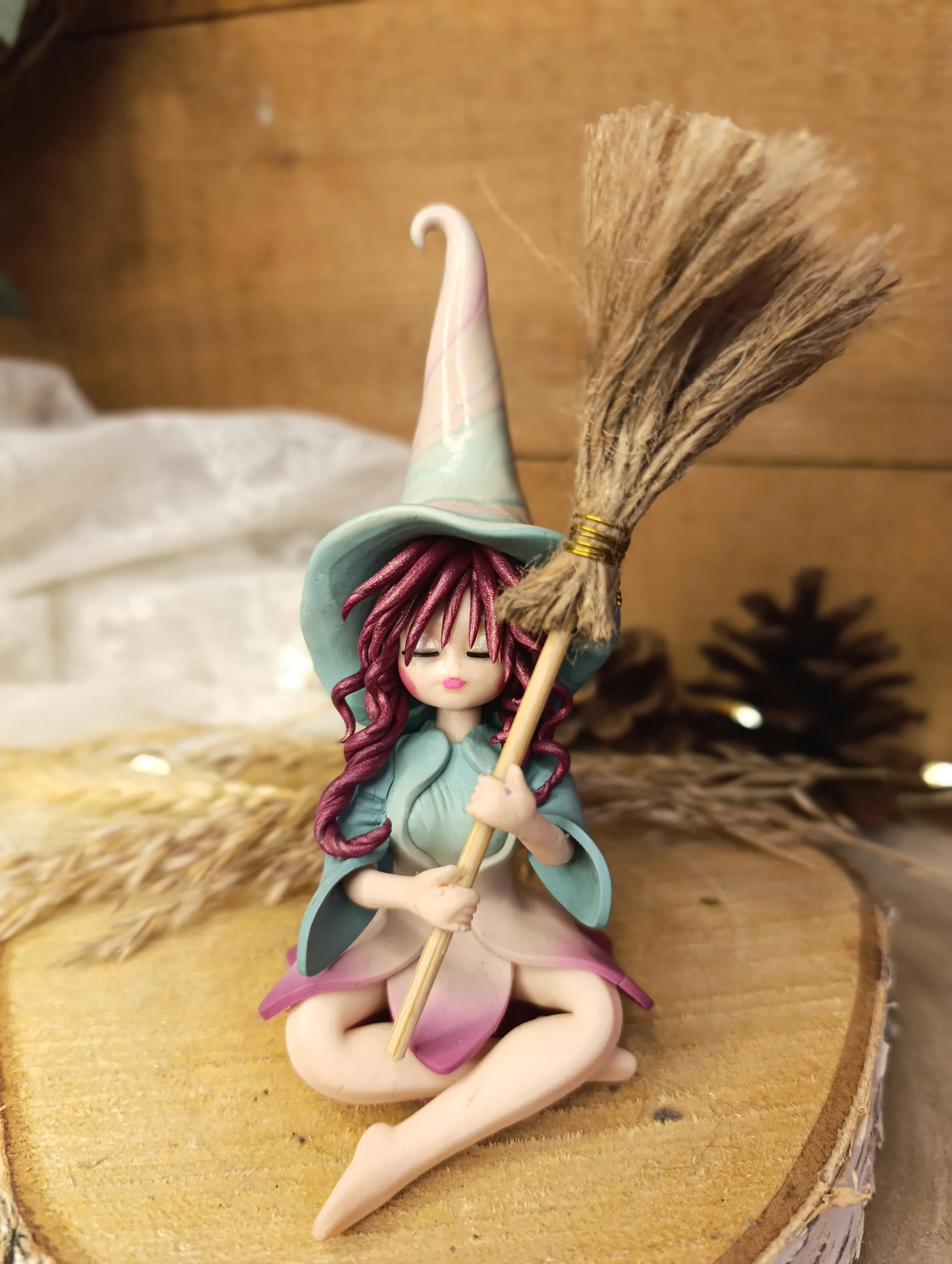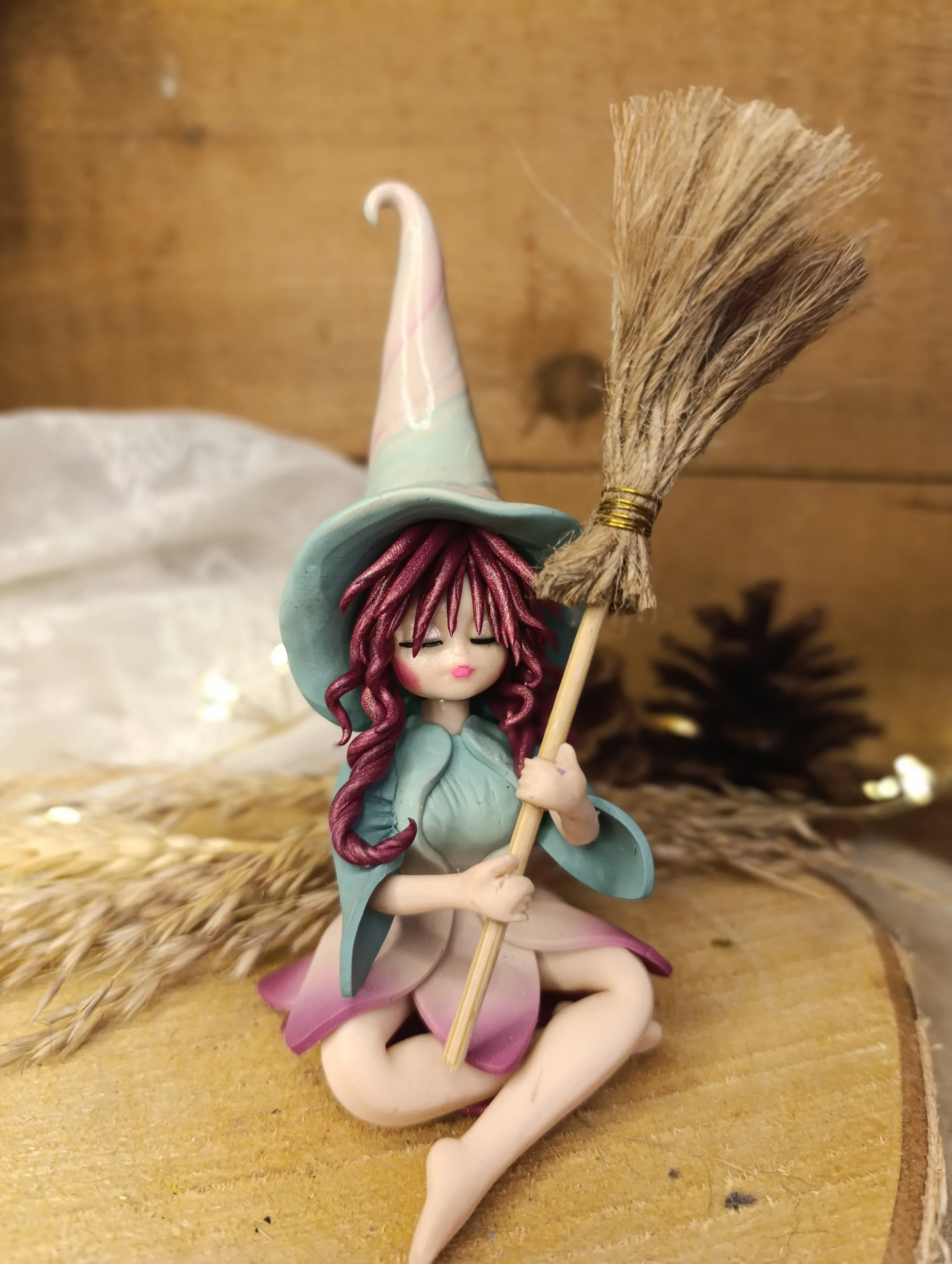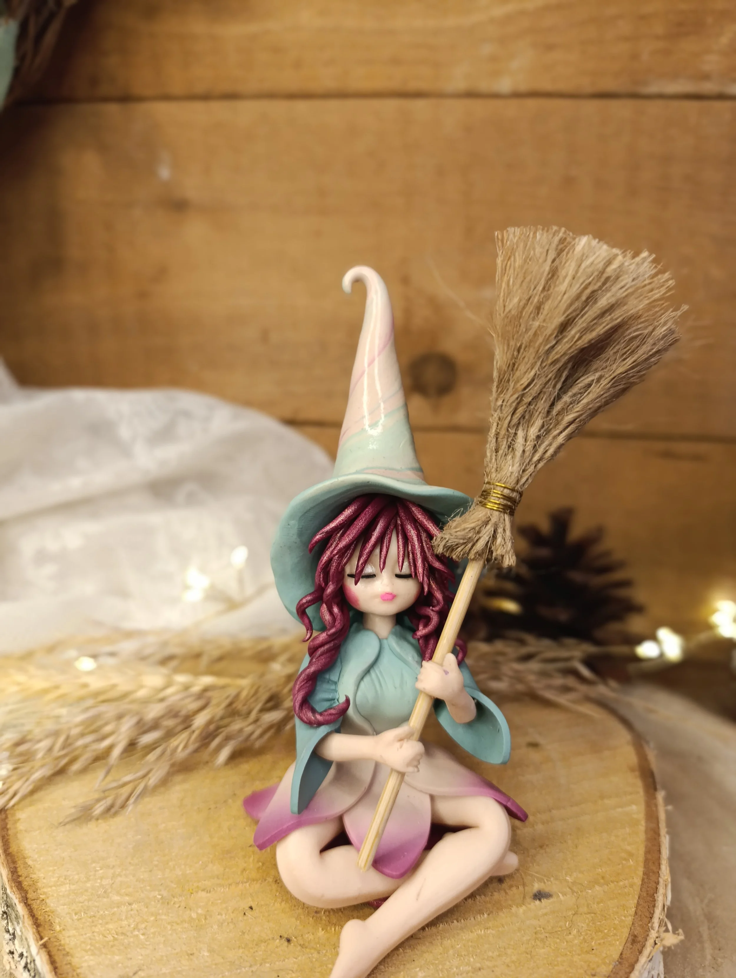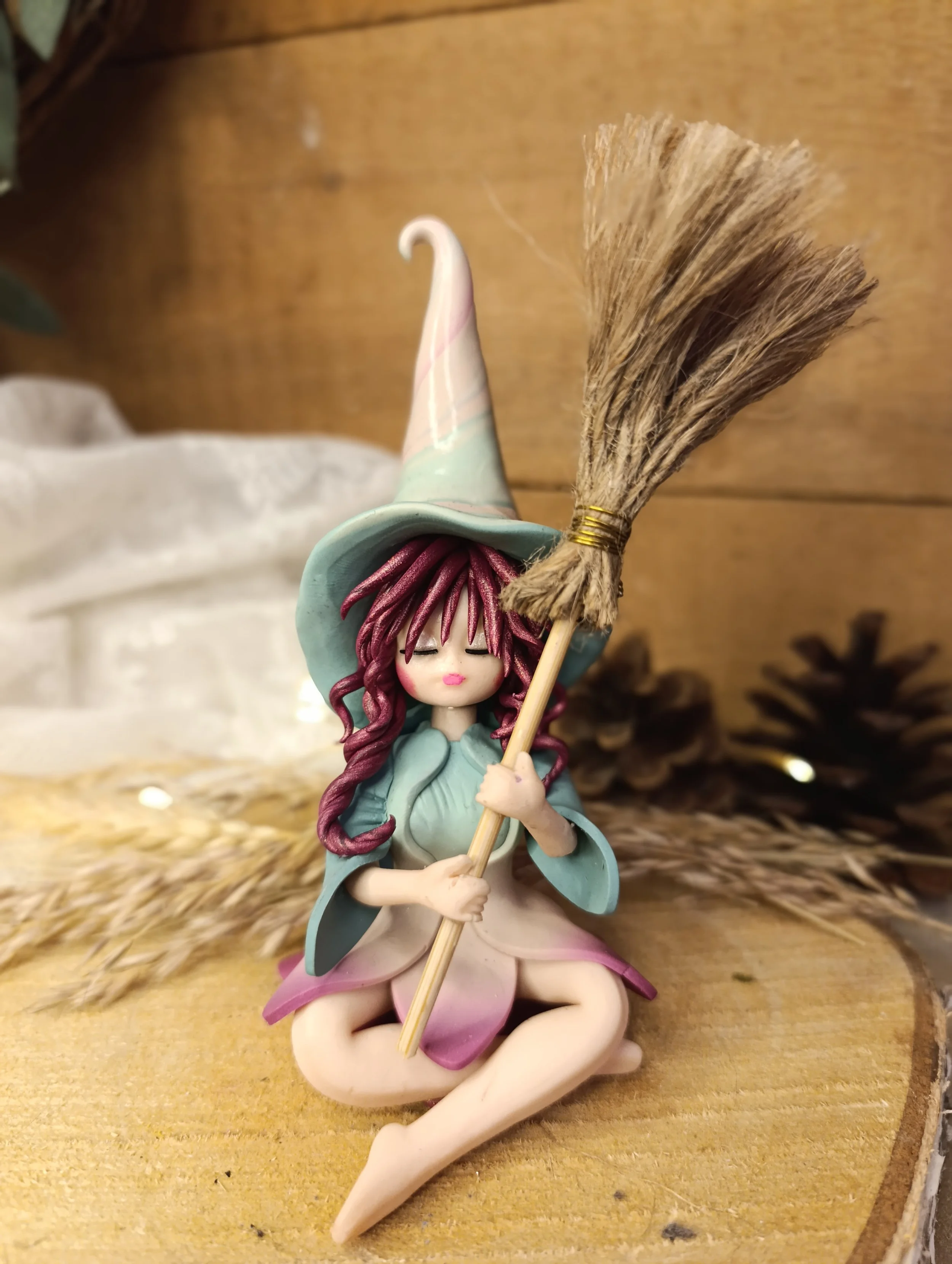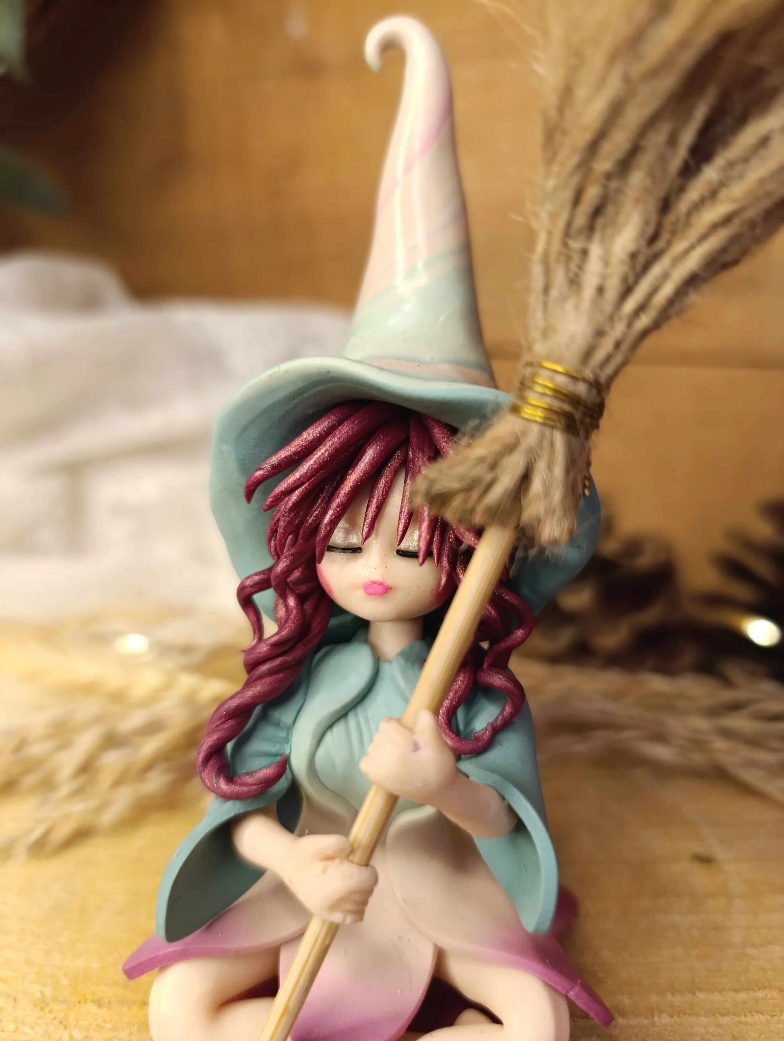 Sous son grand chapeau pastel, entre le vert d’eau et le rose poudré, se cache une sorcière au cœur tendre, messagère du renouveau.