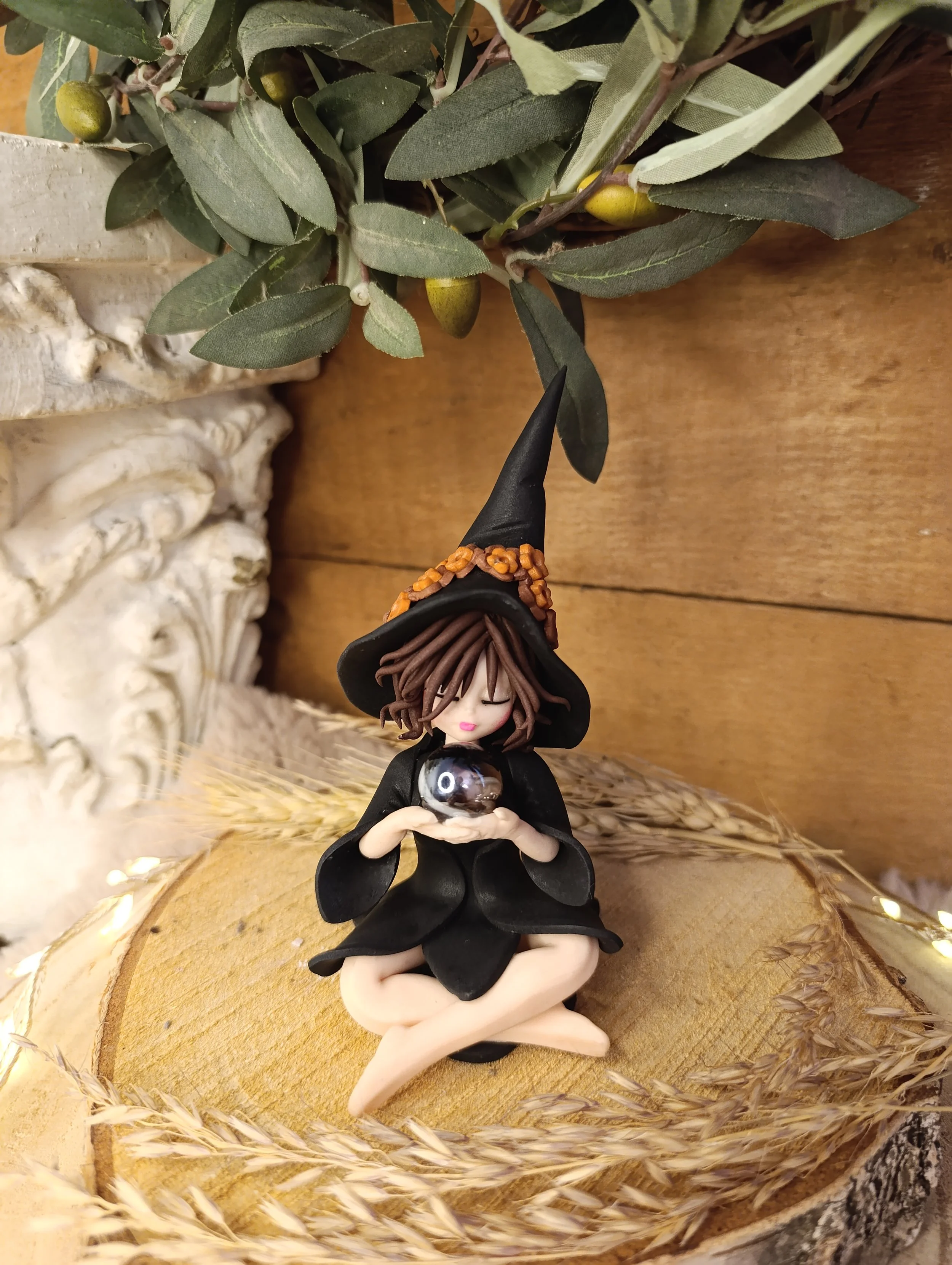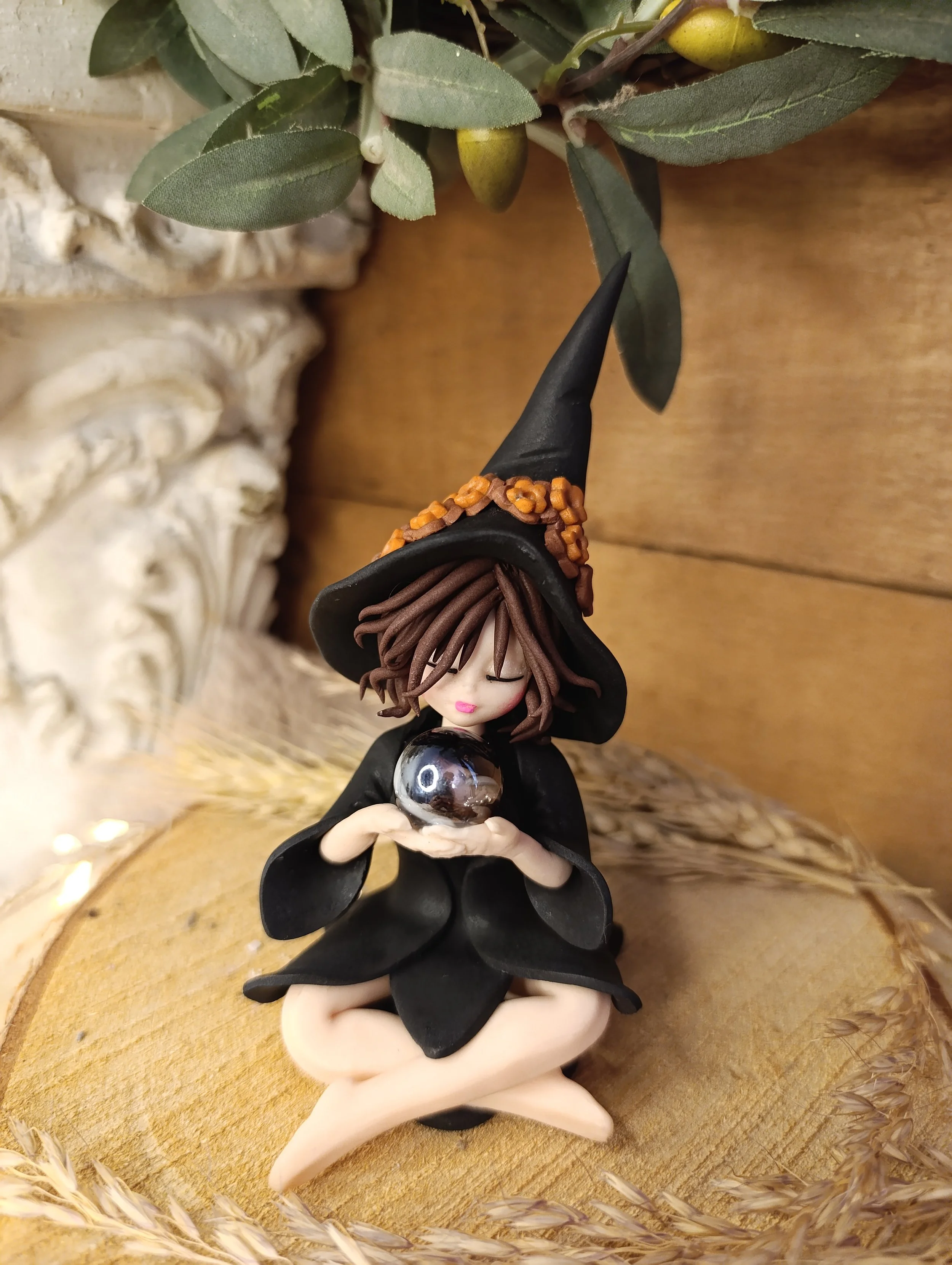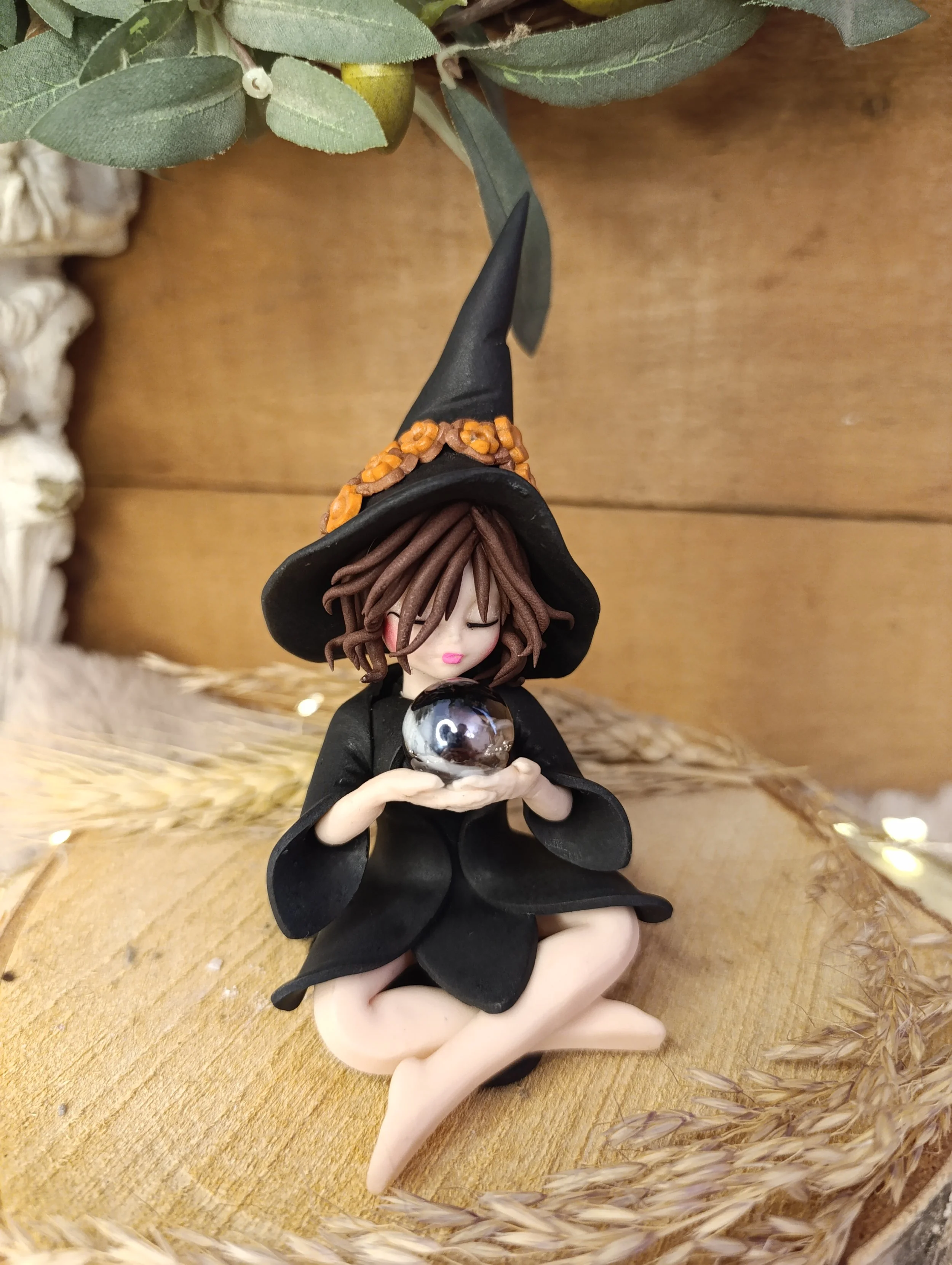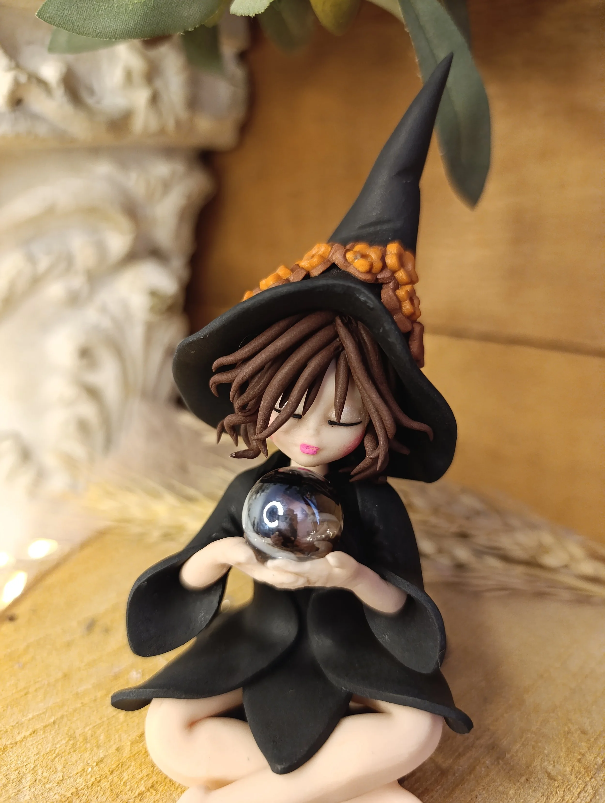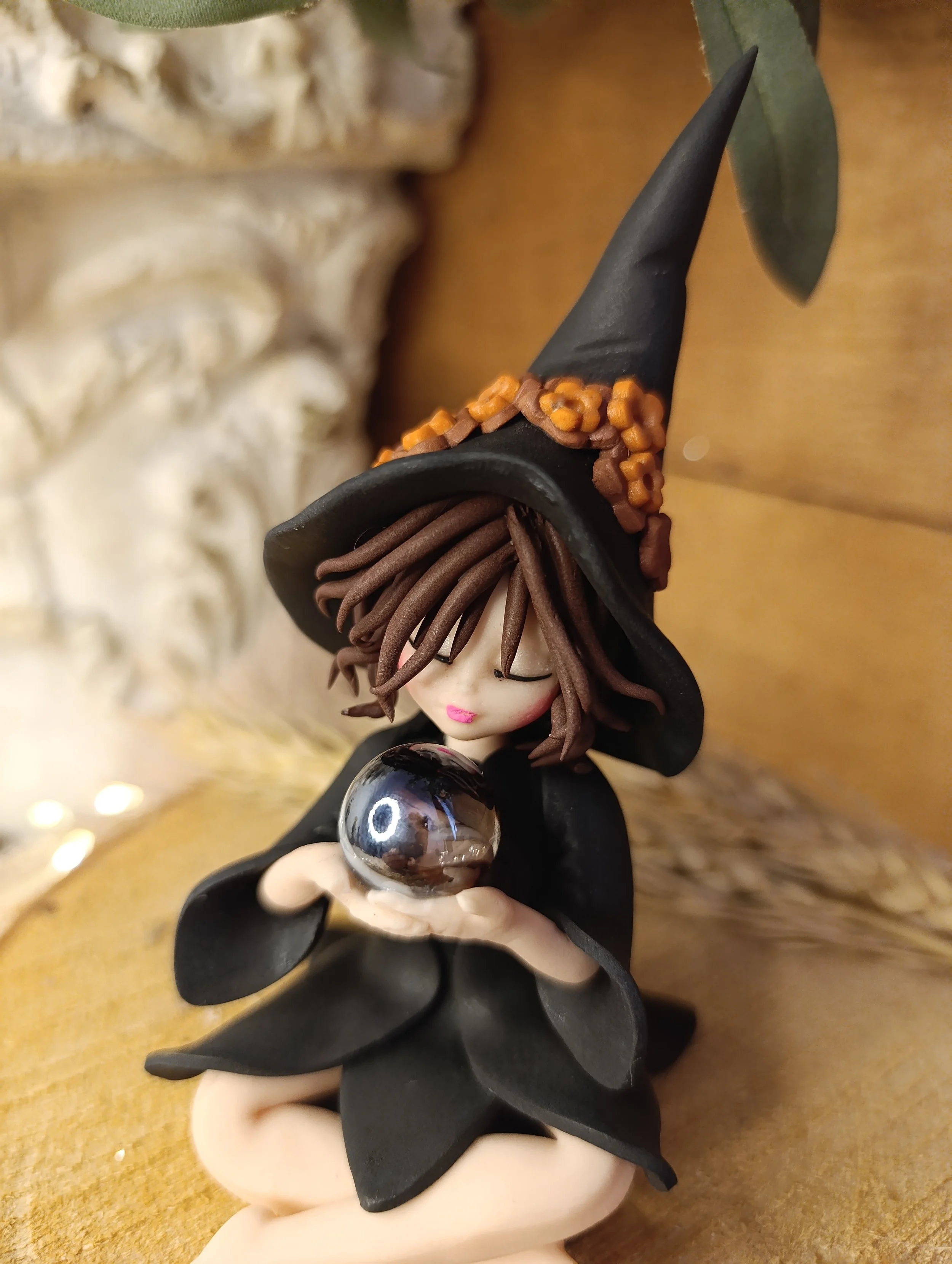 Pièce unique — Figurine sorcière artisanale entièrement modelée à la main en pâte polymère (Fimo). Sphère de cristal véritable. Cape noire. Chapeau noir avec ornements. Robe noire en pétales. Finition satinée.