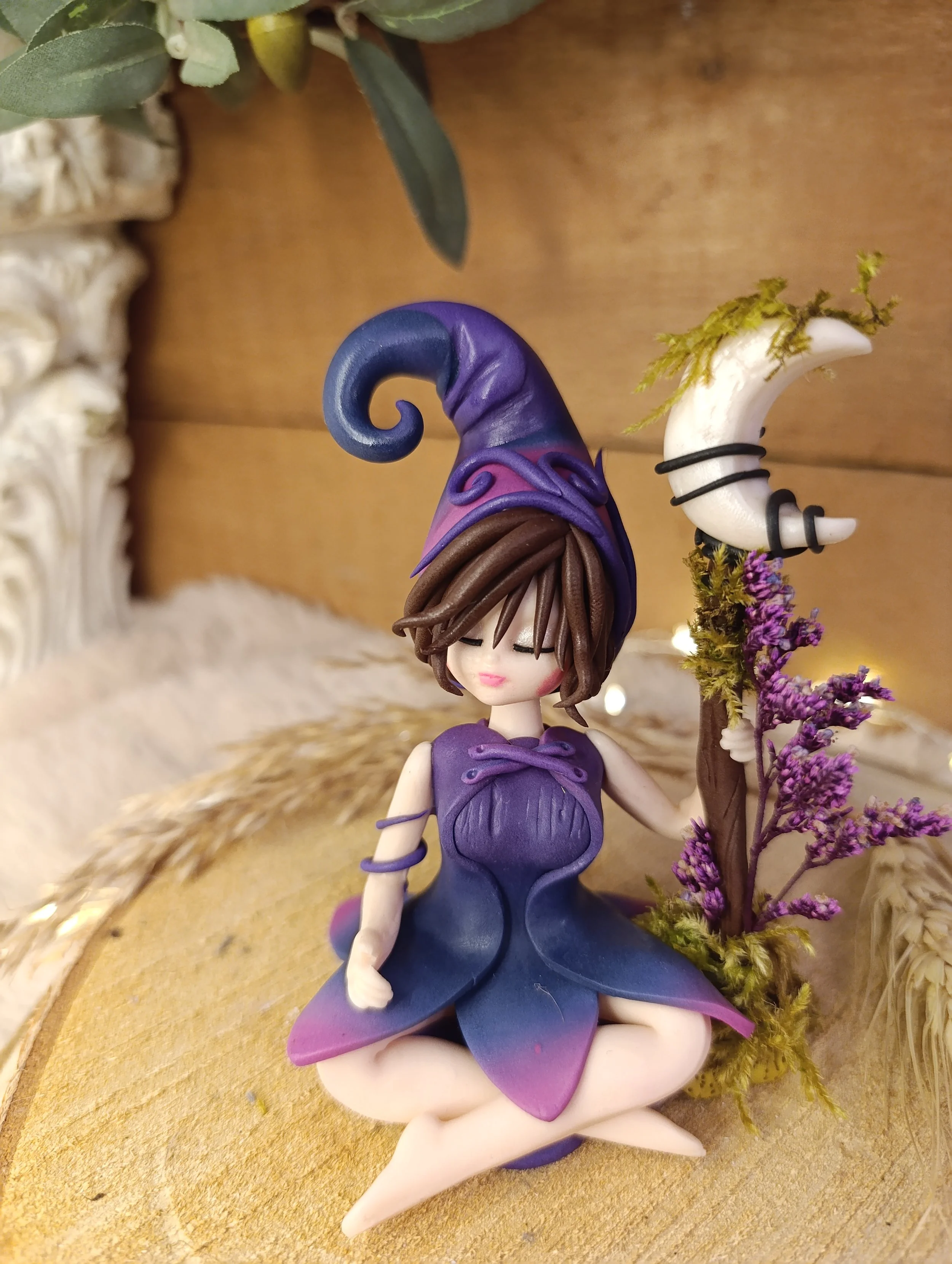 Pièce unique — Figurine sorcière artisanale entièrement modelée à la main en pâte polymère (Fimo). Chapeau de sorcière violet avec spirale et volutes. Cheveux bruns courts. Robe en pétales bleu marine et violet avec dégradé fuchsia. Bâton en bois avec mousse véritable, fleurs séchées violettes et croissant de lune en polymère. Finition satinée.