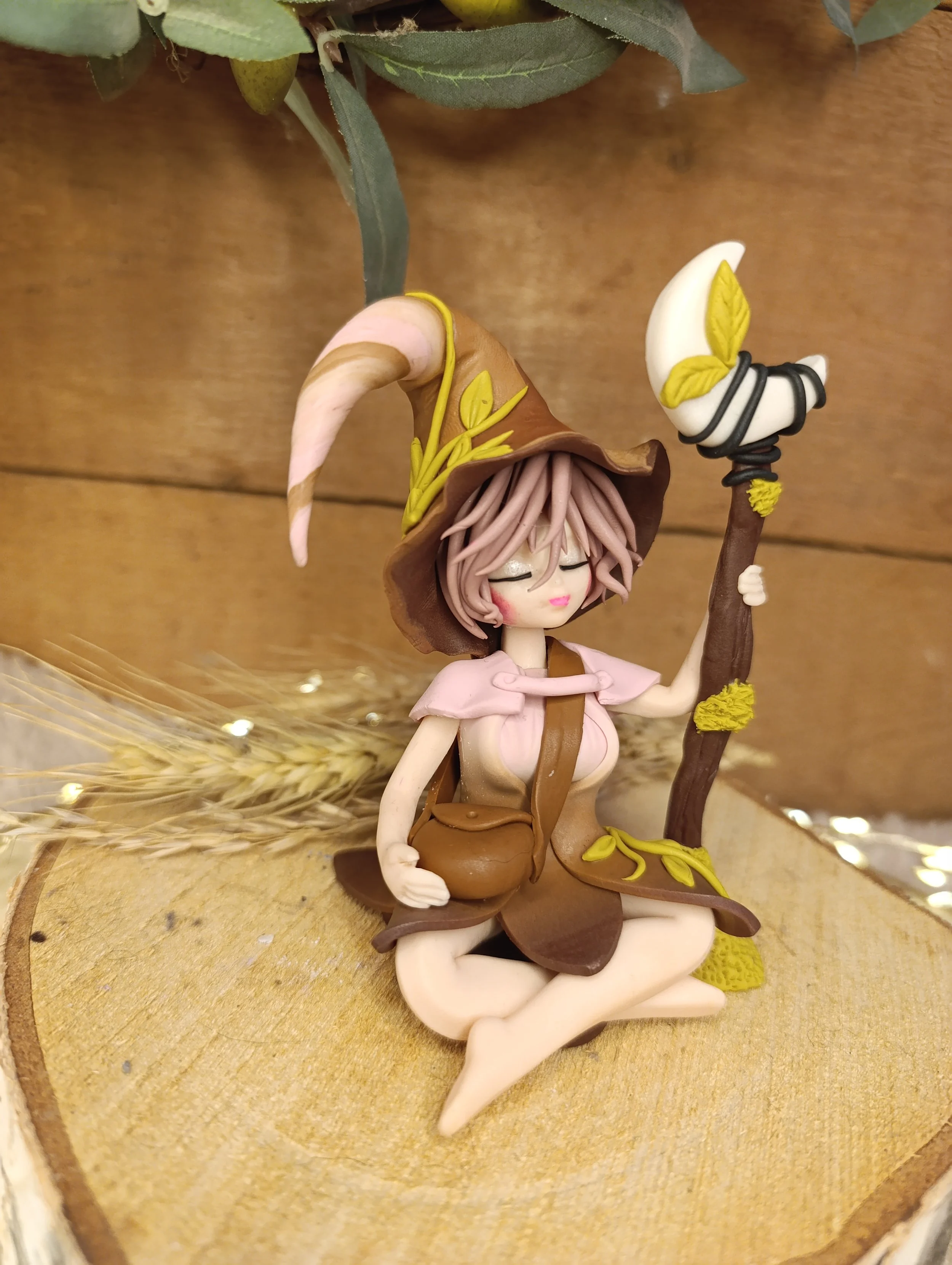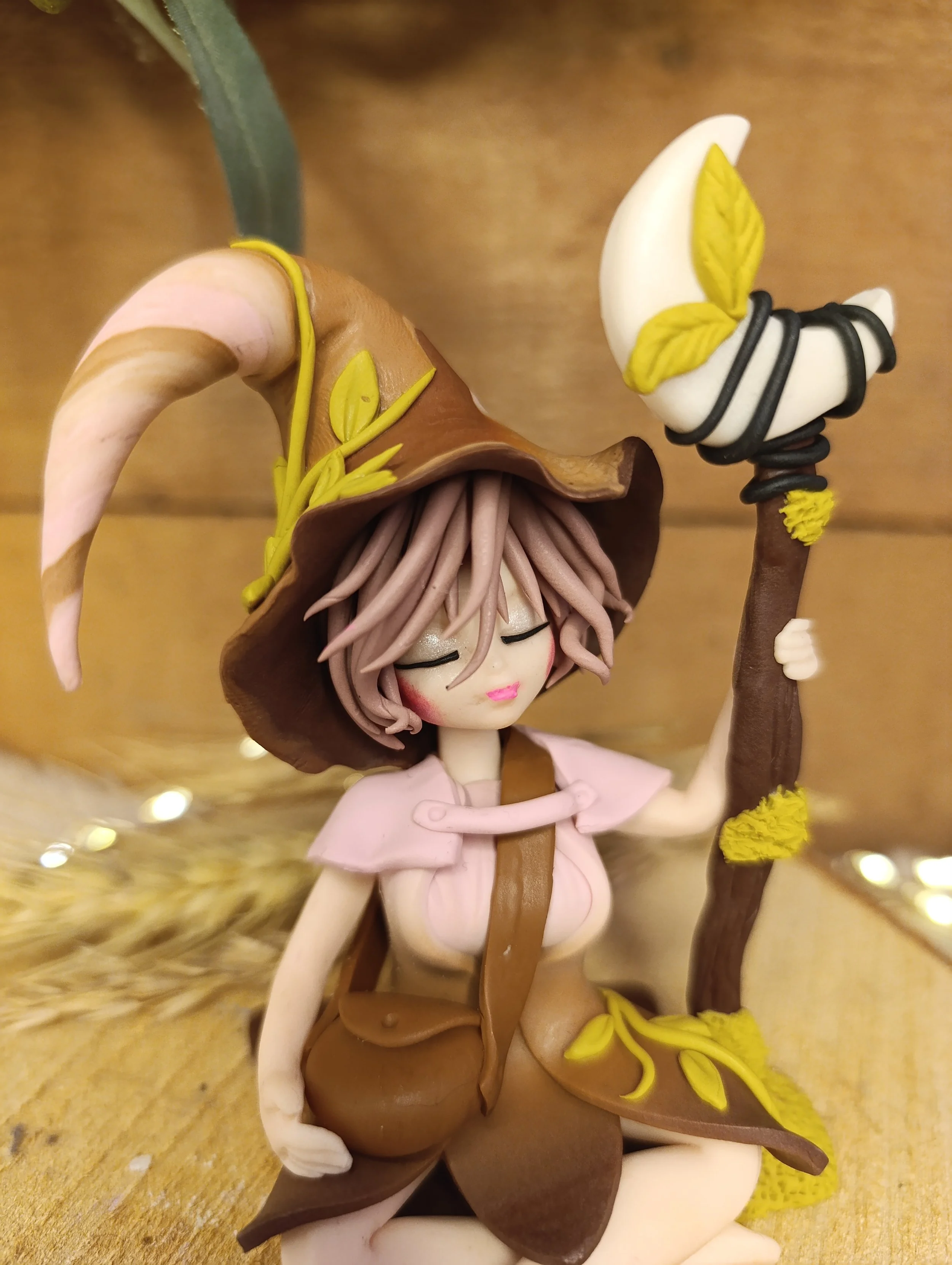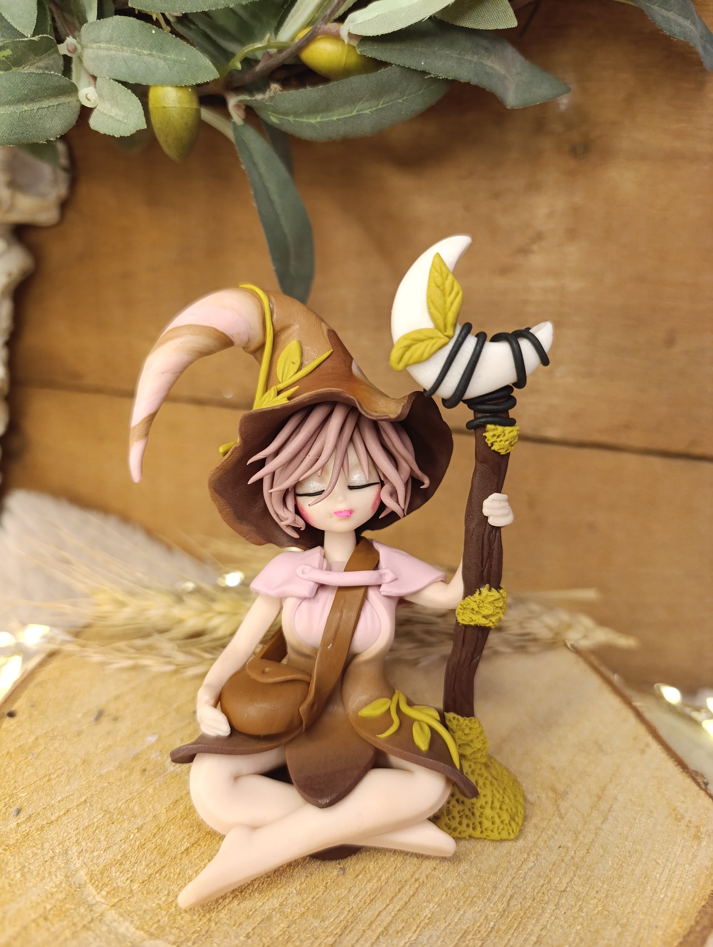 Découvrez Séléné, une compagne des passages façonnée à la main en pâte polymère (Fimo), vernie d'une finition satinée. Assise paisiblement, elle tient son bâton de lune, prête à éclairer les chemins que vous ne connaissez pas encore.